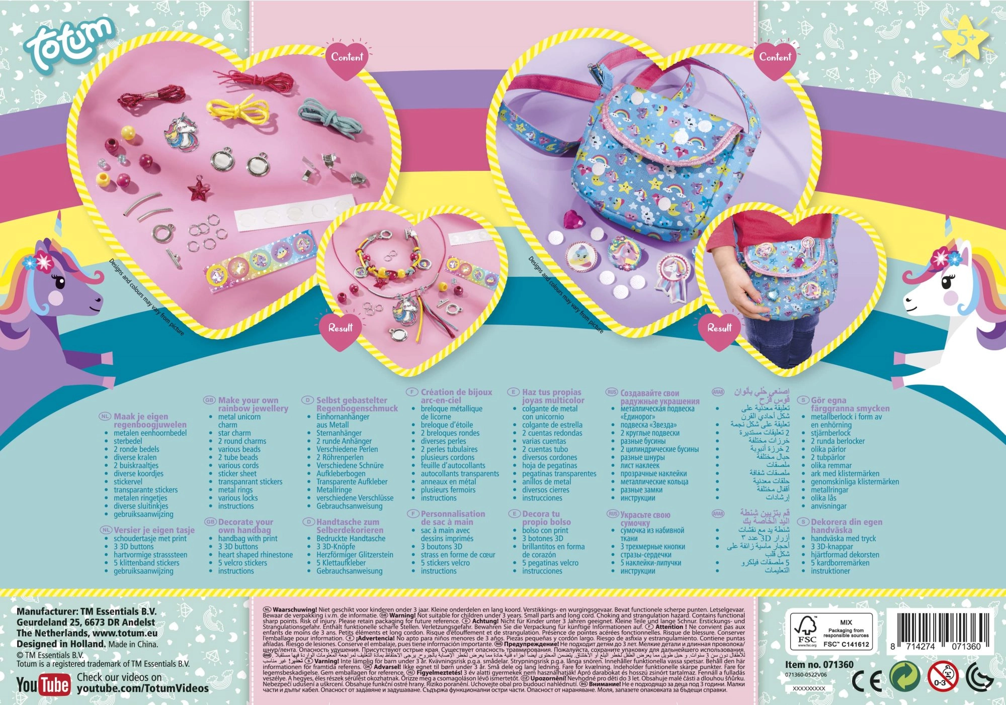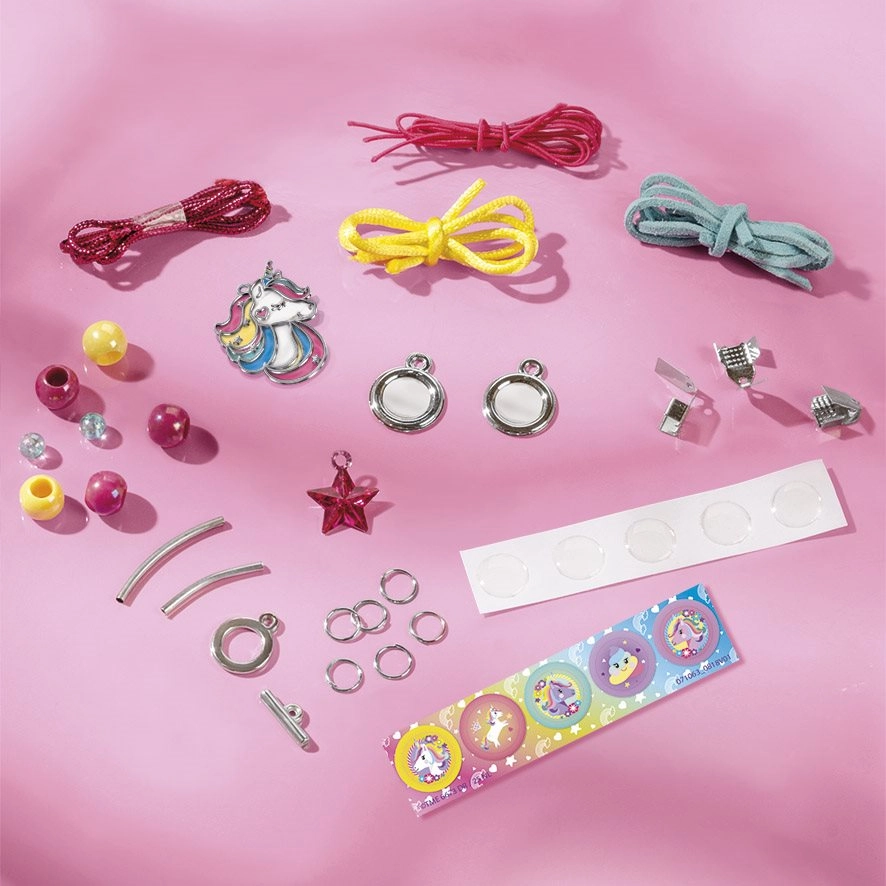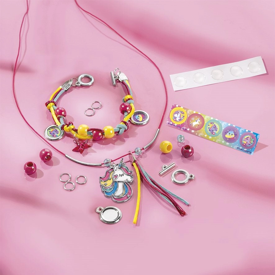 Tato kouzelná kreativní sada přináší dvojitou zábavu: výrobu šperků a zdobení kabelky. Děti si snadno vytvoří náramek a náhrdelník s korálky a přívěskem jednorožce a následně vyzdobí látkovou kabelku pomocí 3D knoflíků, samolepek na suchý zip a třpytivých kamínků ve tvaru srdce.