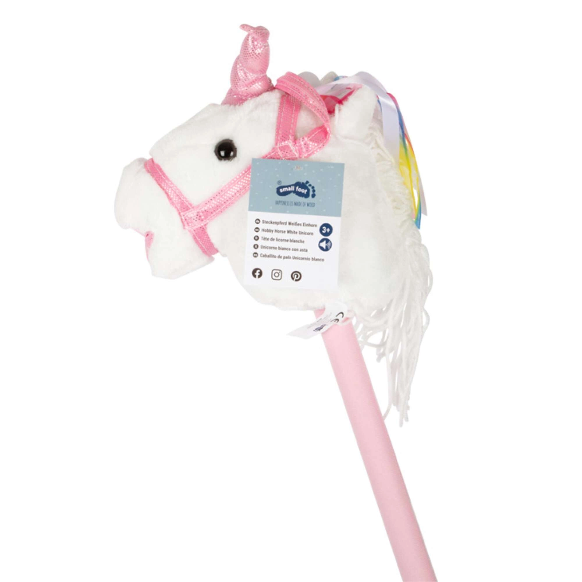 Roztomilý hobby horse jednorožec od značky Small Foot potěší všechny malé jezdce. Má měkoučkou plyšovou hlavu s růždí a třpytivým rohém, lehký a pevný dřevěný kůl pro pohodlné držení a zvukové efekty klusu a ržání na tlačítko v uchu. Perfektní pro kreativní i aktivní hru doma i venku.