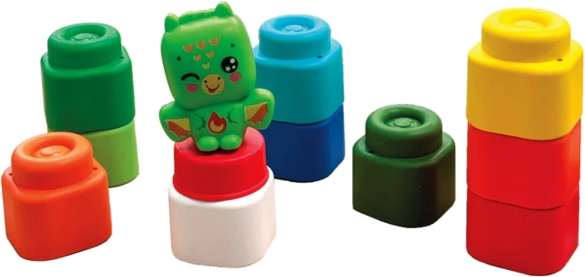 Díky snadnému uchopení děti kostky snadno spojují a staví první věžičky a konstrukce. Hra přirozeně rozvíjí jemnou motoriku, koordinaci oko–ruka, kreativitu a podporuje smyslové vnímání. Zábavu obohacuje roztomilá figurka dráčka, která vyzývá k příběhům a rolovým hrám.