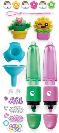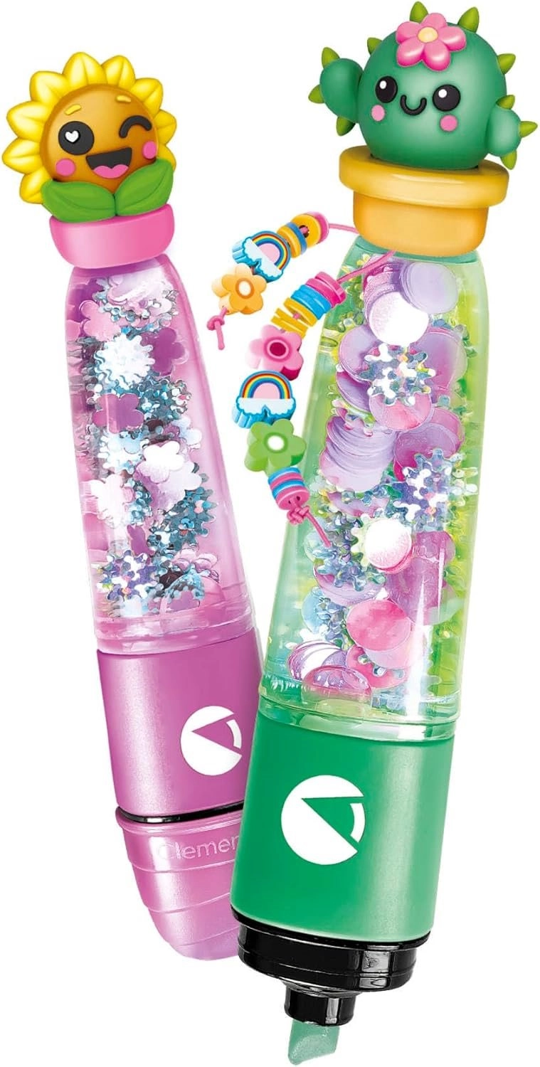 S touto sadou si děti složí a dozdobí dva unikátní zvýrazňovače, do jejichž průhledných tělísek mohou přidat třpytky, korálky a plovoucí ozdoby. Roztomilé toppers ve tvaru kaktusu a slunečnice promění každé psaní ve hru a zvýrazňování ve stylovou zábavu.