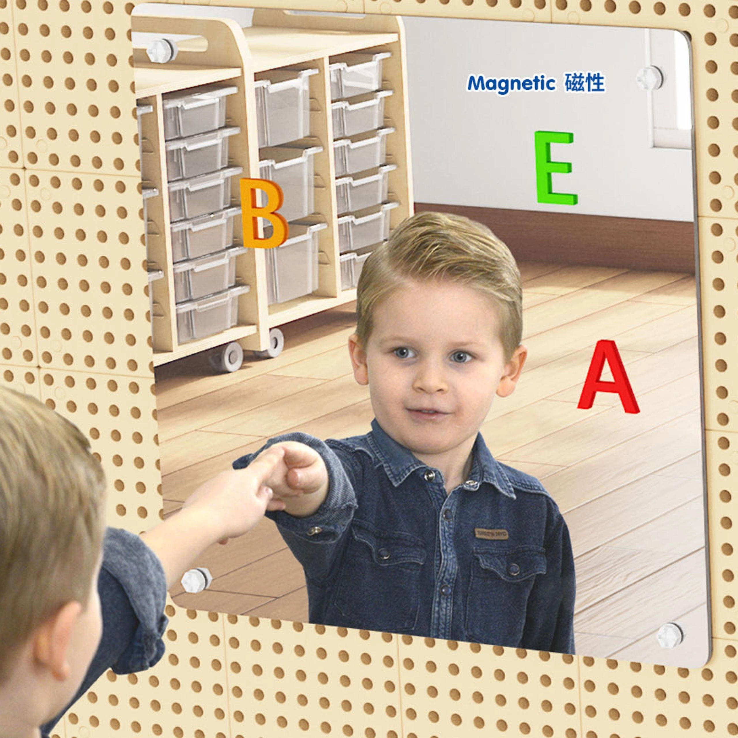 Velké magnetické zrcadlo MASTERKIDZ promění každou učebnu či dětský koutek v interaktivní centrum učení. Unikátní magnetický povrch umožňuje připevnění písmen, čísel a didaktických prvků, zatímco děti zkoumají mimiku, emoce a koordinaci pohybů. Rozměr 60 × 60 cm poskytuje dostatek prostoru pro skupinové i individuální aktivity.