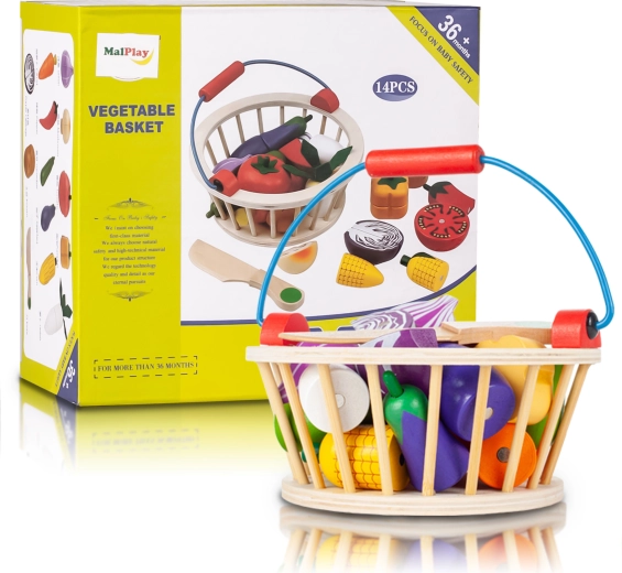 Objevte kreativní hru pro malé kuchaře: dřevěný košík se zeleninou na krájení s magnety pro snadné spojování. Set obsahuje košík, bezpečný dětský nůž a zeleninu rozdělenou na poloviny, která se díky dvěma magnetům znovu spojí. Ideální pro rozvoj jemné motoriky, učení barev a tvarů a nápodobu vaření od 3 let.