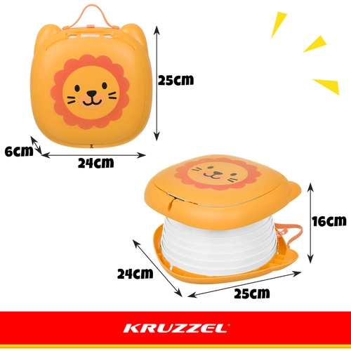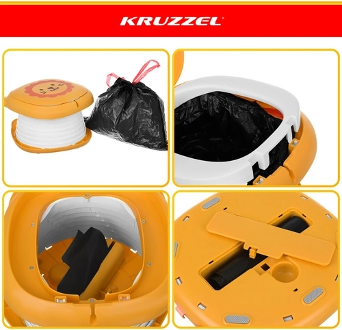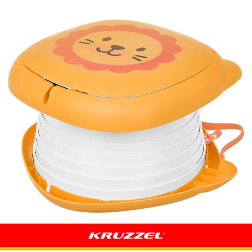 Skládací nočník KRUZZEL – Lev je navržený pro pohodlí dětí i klid rodičů na cestách. Roztomilý lví design motivuje dítě k použití mimo domov, zatímco pevná konstrukce z ABS a silikonový měchýř zajišťují komfort, stabilitu a snadné čištění. Integrovaný úložný prostor na roličku sáčků znamená, že vše potřebné máte vždy po ruce.