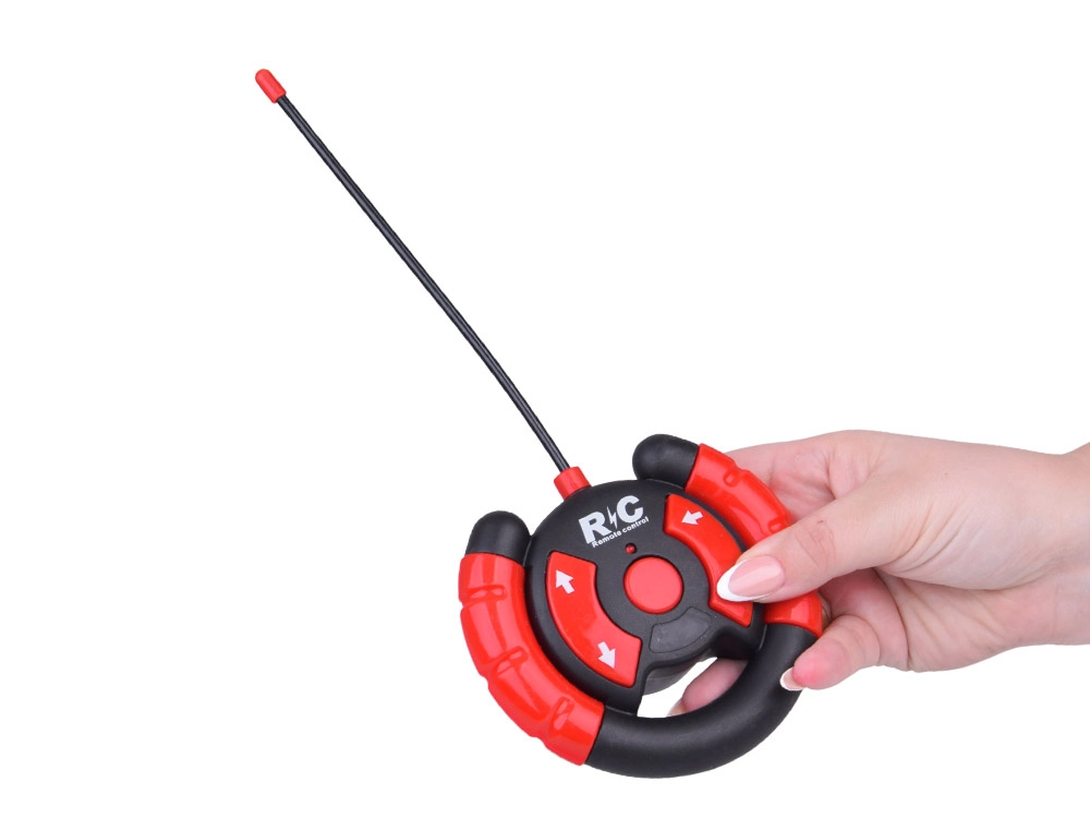 Kulatý ruční ovladač s jasně značenými šipkami a dlouhou anténou umožňuje snadné řízení všemi směry a automaticky se páruje s autem.
