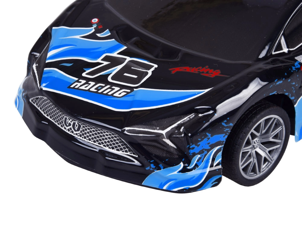Sleek černá karoserie s modrými závodními potisky a realistickými koly dodává modelu autentický sportovní charakter.