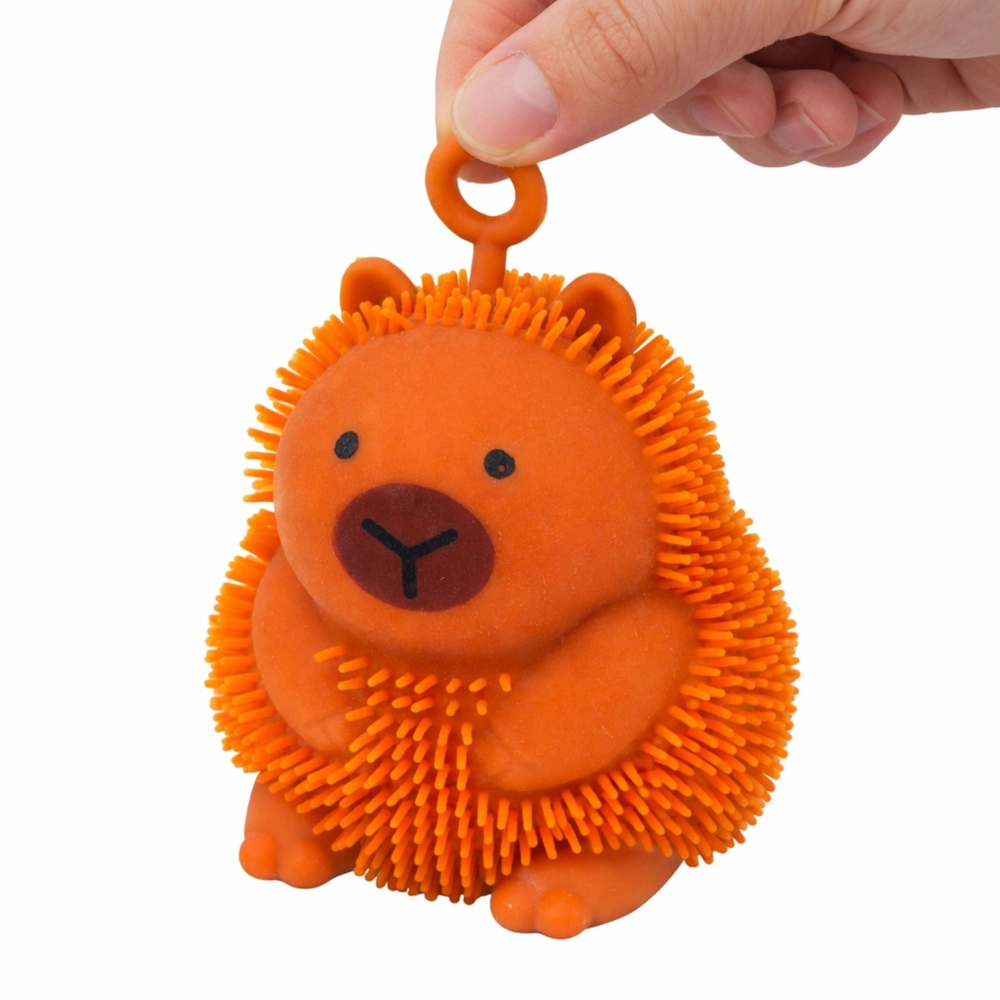 Roztomilý senzorický gniotek ve tvaru kapybary přináší okamžitou úlevu od napětí a spoustu zábavy. Díky měkkému a pružnému materiálu jej můžete mačkat, natahovat i odrážet, zatímco barevná LED dioda při nárazu zabliká. Příjemná textura s jemnými výstupky stimuluje hmat a poutko umožní snadné držení či zavěšení.