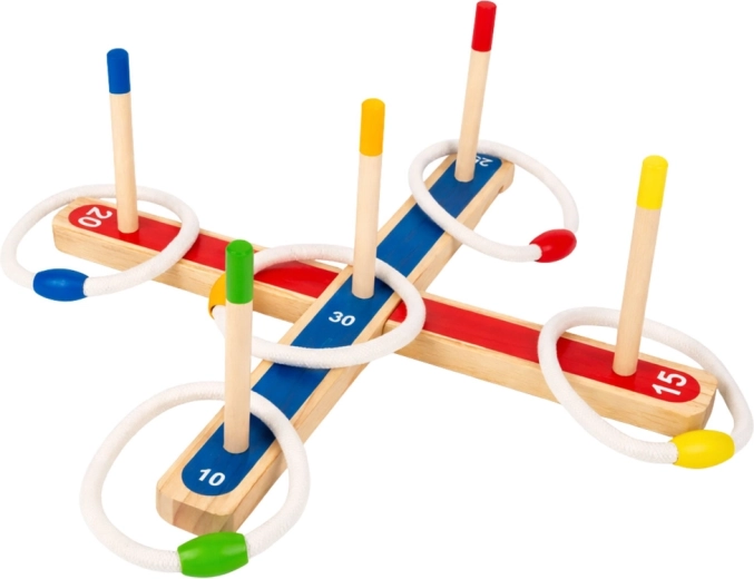Dřevěná házecí hra typu ring toss spočívá v trefování kroužků na svislé kolíky s přiřazenou bodovou hodnotou. Vyhrává hráč s nejvyšším součtem bodů, takže je ideální pro rodinné turnaje i lehký trénink přesnosti.