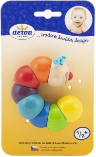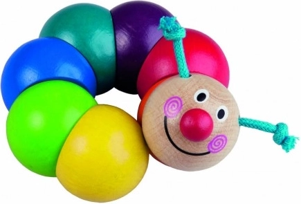 Barevná dřevěná housenka z korálků navlečených na gumičce podporuje rozvoj jemné motoriky už od 6 měsíců. Je zdravotně nezávadná, splňuje normy EU a díky kompaktní délce 13 cm se skvěle drží i v malých ručičkách.