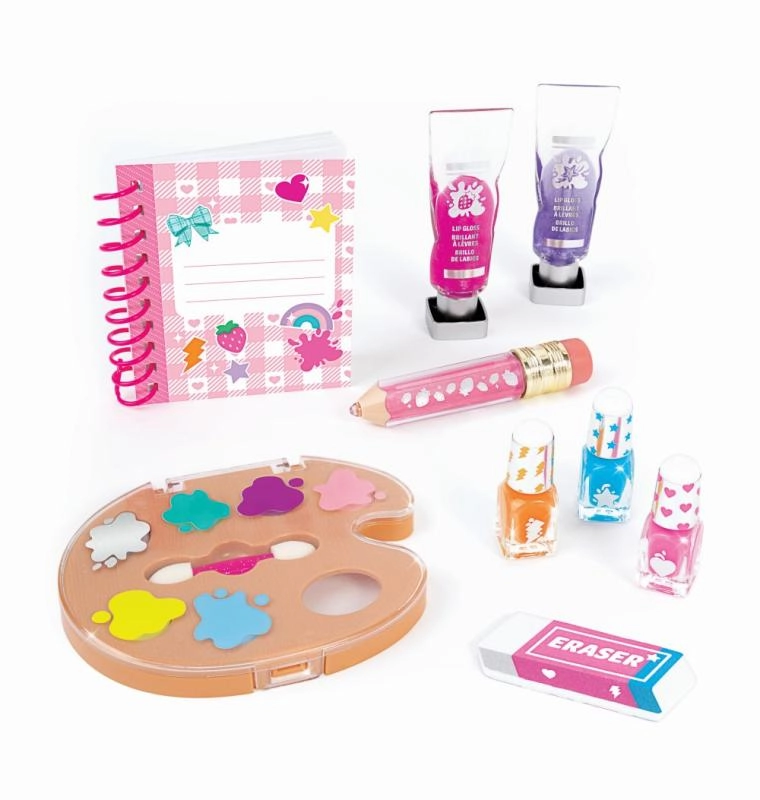 Součástí jsou lesky na rty stylizované jako malířské tuby, tři laky na nehty v jasných odstínech a pilník na nehty ve tvaru gumy pro dokonale upravené nehty. Vše je navrženo tak, aby podpořilo kreativní hru, bezpečné experimentování a rozvoj stylu u dětí od 8 let.