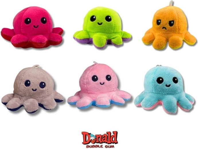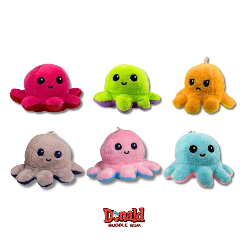 Objev hravý svět překvapení! Flip plyšová chobotnice ukrývá dva rozdílné výrazy – stačí ji jednoduše převrátit a změnit náladu i vzhled. V každé kapsli navíc najdeš 5 legendárních žvýkaček DONALD, které potěší chutí i nostalgií.