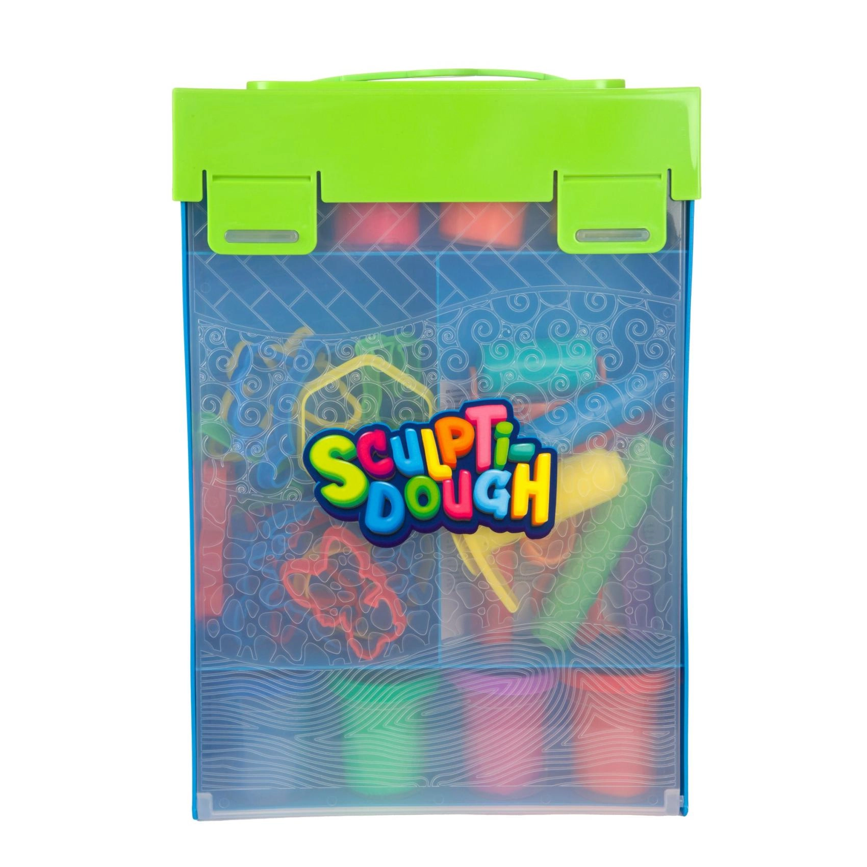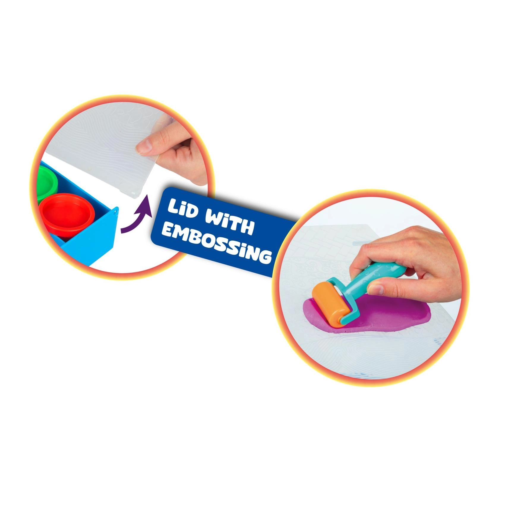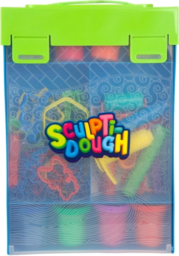 Součástí je široká škála nářadí a formiček – váleček, kolečkové řezačky, nůžky, nožíky, texturovací válečky i extrudér, které dětem otevírají nové možnosti modelování. Plastový box s víkem a rukojetí udrží kelímky i doplňky pohromadě, takže se sada snadno uklízí a přenáší.