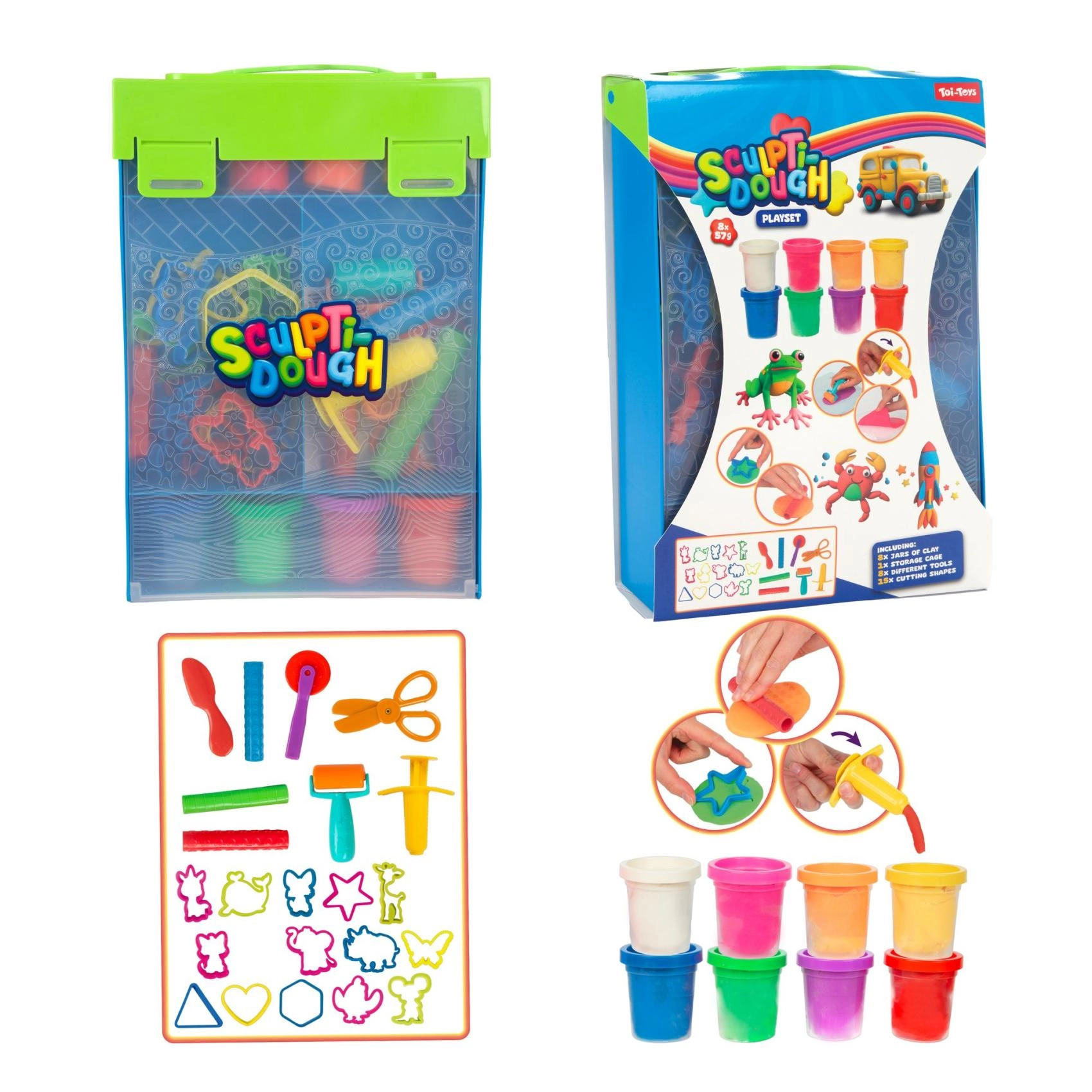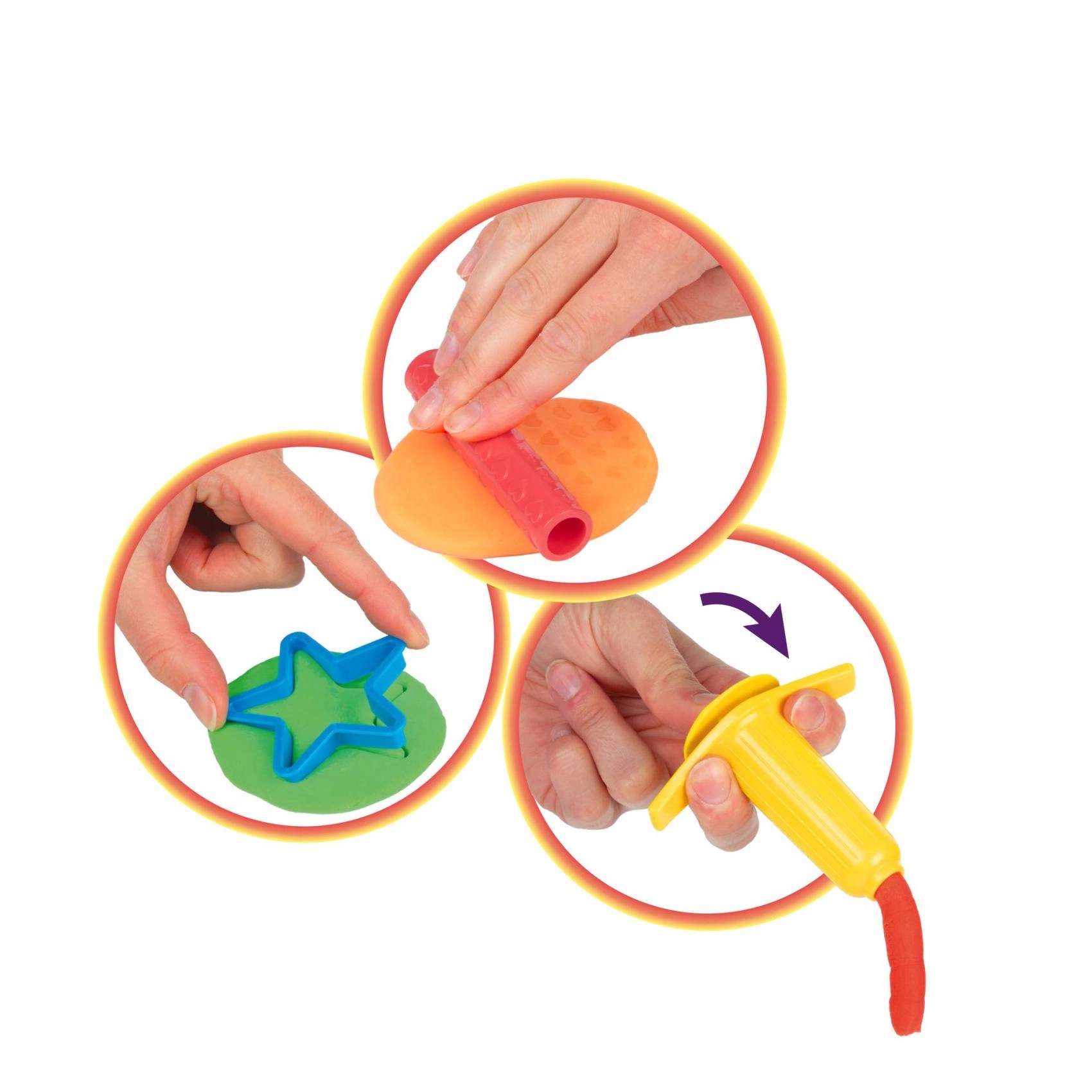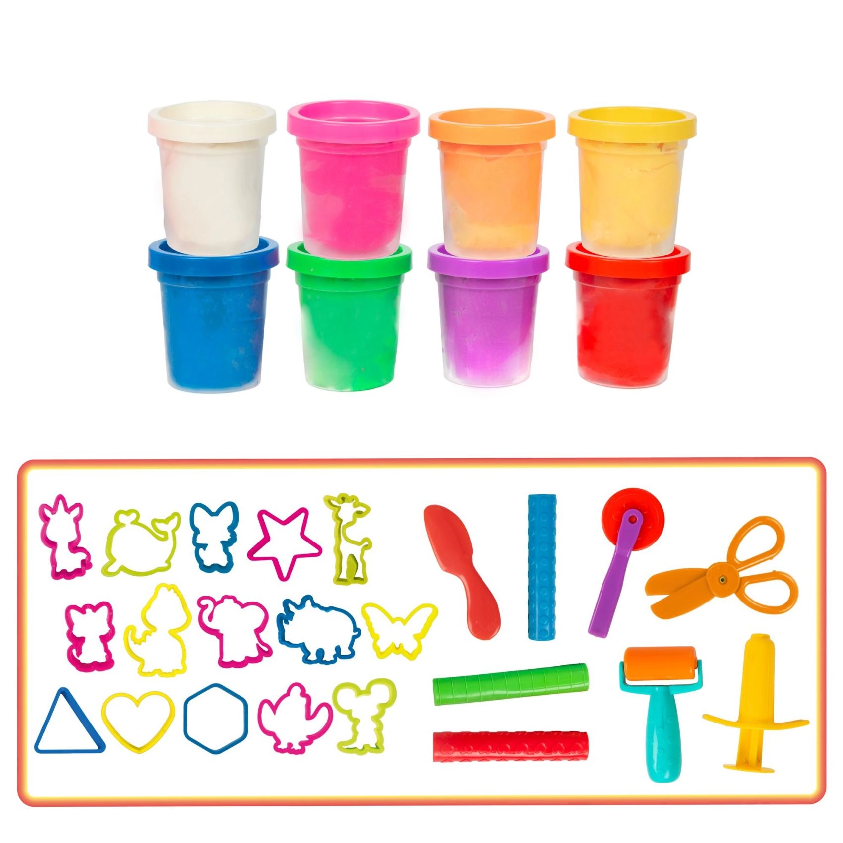Osm kelímků modelíny doplňují válečky, nožíky, nůžky a formičky – děti mohou hned začít tvořit bez dalšího dokupování.