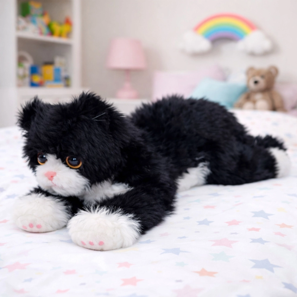 Roztomilá plyšová kočka v černo‑bílé barvě je měkká, hebká a připravená k mazlení. Díky realistickému provedení, jemnému kožíšku a bezpečným, příjemným materiálům si ji děti rychle zamilují jako kamaráda na hraní i spaní.