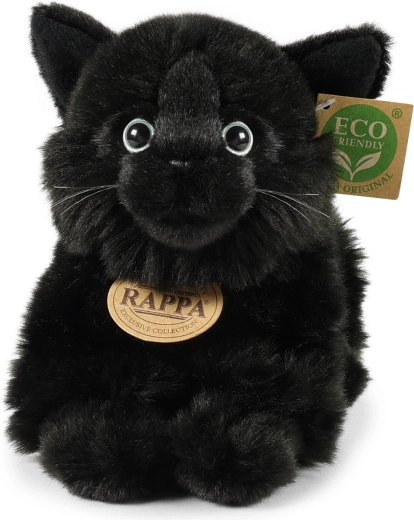 Roztomilá černá plyšová kočka o velikosti 22 cm je vyrobena z měkkého, hebkého materiálu a patří do exkluzivní kolekce RAPPA. Díky ručnímu zpracování působí realisticky a je ideální na mazlení, hraní i jako dekorace. Výplň z recyklovaných materiálů (PET lahví) je bezpečná i pro novorozence a šetrná k přírodě.
