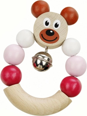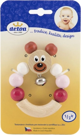 Růžové dřevěné chrastítko Detoa s medvídkem a jemnou rolničkou. Lehoučké, 7 × 9 cm, od 6 měsíců. Certifikace Bezpečné hračky, splňuje normy EU.