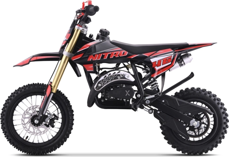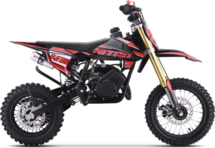 Objevte adrenalin s dětskou terénní motorkou NITRO 60cc v červeném provedení. Nabízí výkonný dvoutaktní motor, hydraulické odpružení, kotoučové brzdy vpředu i vzadu a robustní ocelový rám. Díky hustému terénnímu vzorku pneumatik a maximální rychlosti až 50 km/h je ideální pro jízdu v terénu. Bezpečnost zvyšuje pojistná trhací šňůra (kill switch) a odolné, pružné plasty.