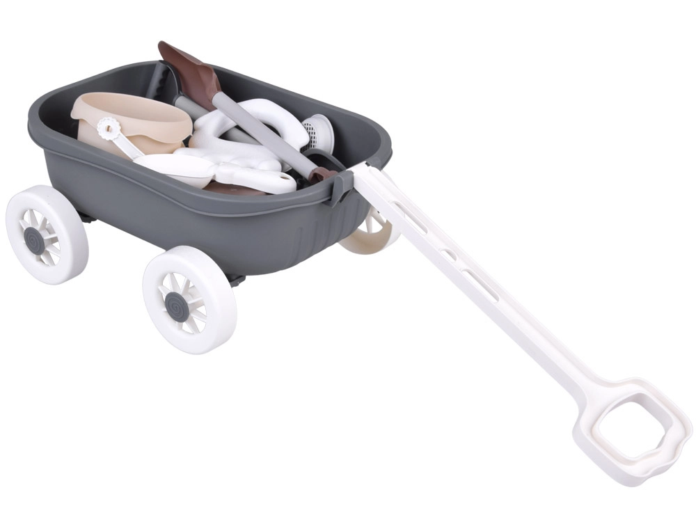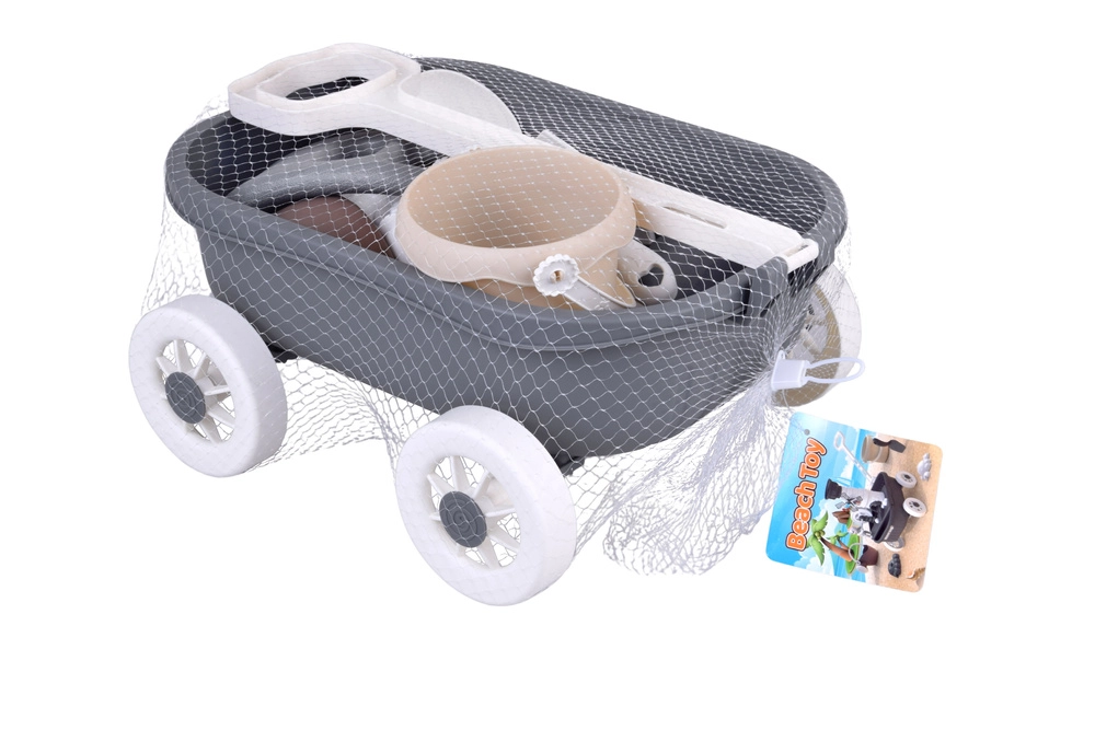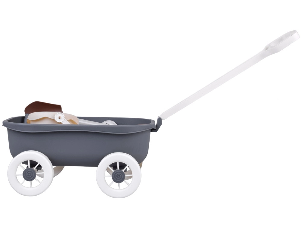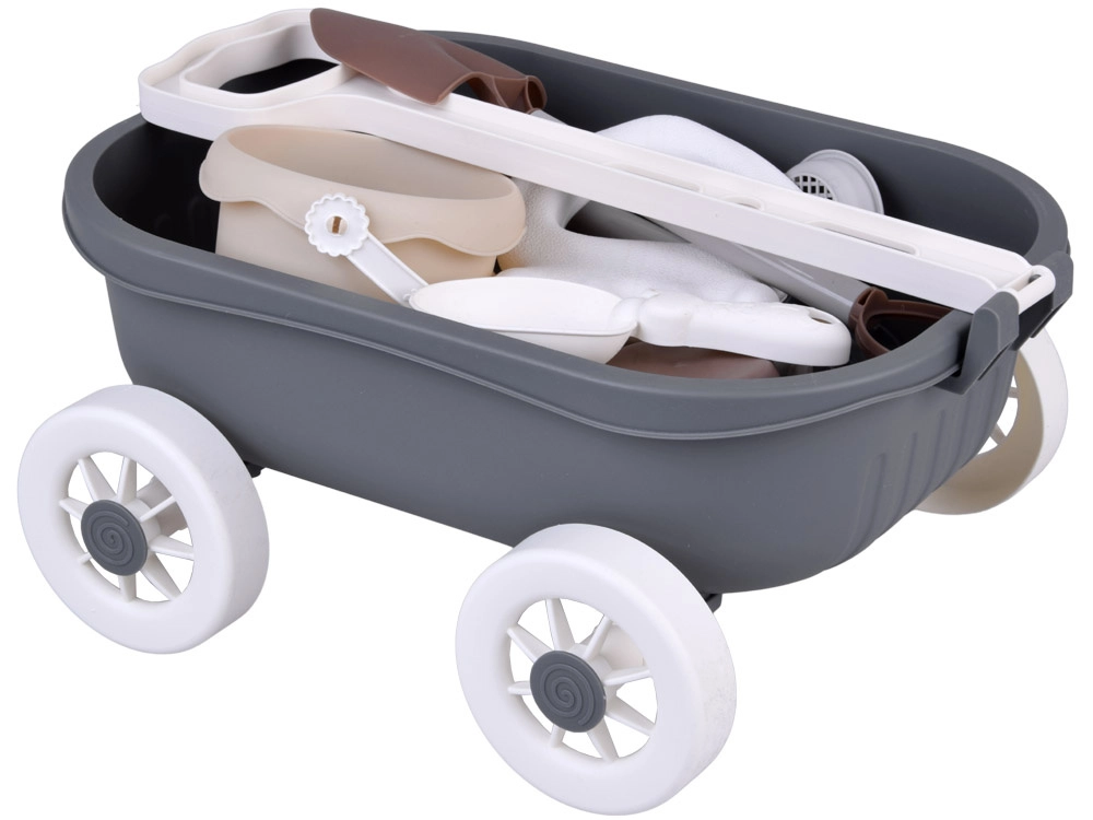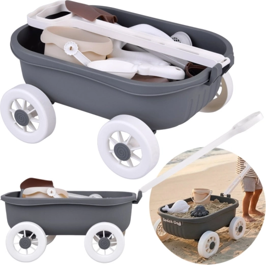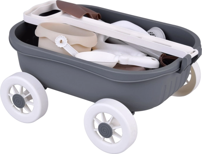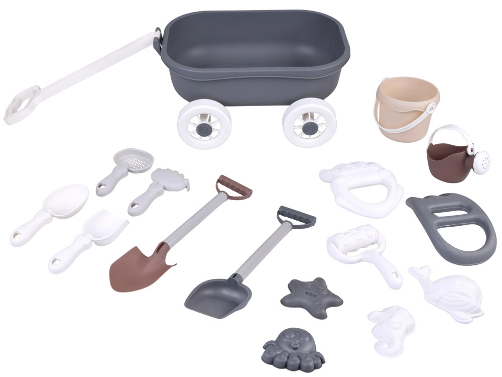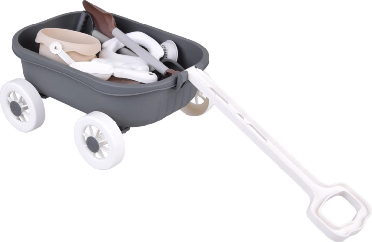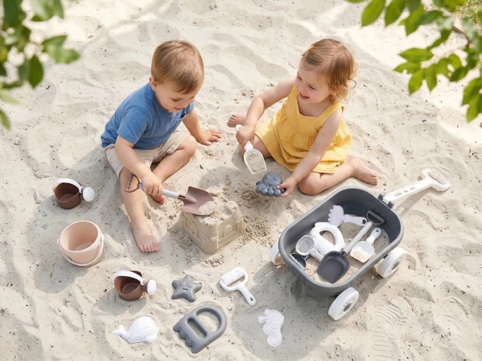 Stylová sada na písek s praktickým vozíkem přináší dětem nekonečnou zábavu na pláži, na zahradě i v pískovišti. Obsahuje až 16 dílů v moderních neutrálních barvách, včetně vozíku na tahání, kyblíku, konevky, lopatek a hrábí, síta a mořských formiček. Odolné plastové provedení a široká kola usnadní převoz hraček i písku, zatímco děti rozvíjejí kreativitu, jemnou motoriku a radost z pohybu venku.