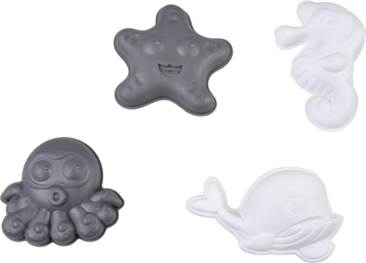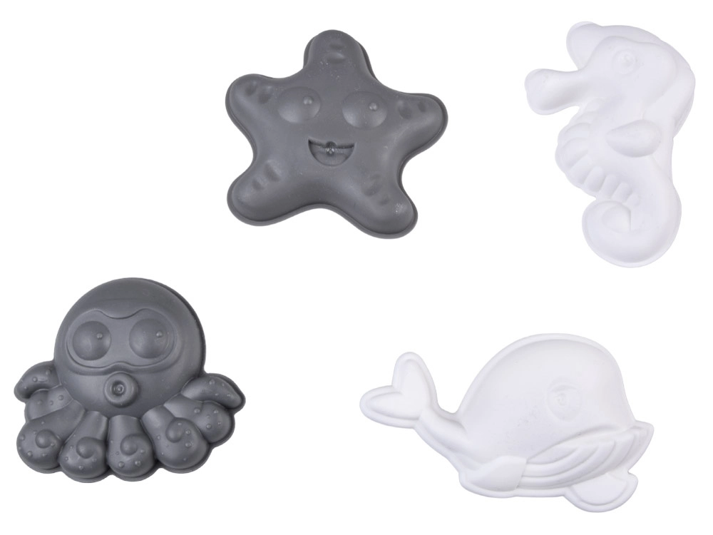 Součástí setu je vše, co je potřeba pro nápaditou hru: 2 velké lopaty (rýč a saperka), 2 menší lopatky–šufánky, hrábě a klešťové hrábě pro hrubší i jemnější práci v písku, síto na prosévání, kyblík, konevka pro zalévání a váleček s mořským vzorem. Tvoření doplní formičky mořských zvířátek – hvězdice, velryba, chobotnice a mořský koník.