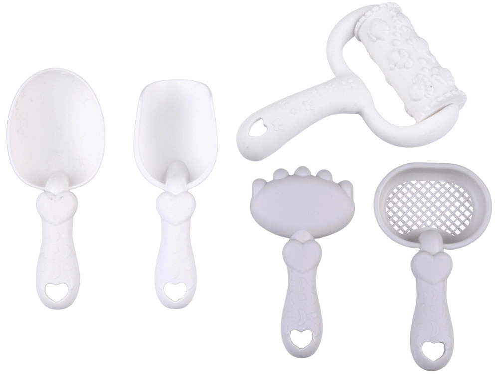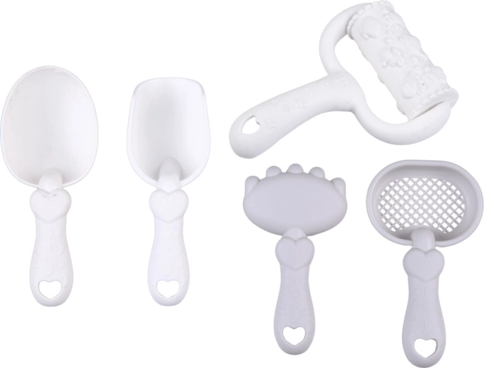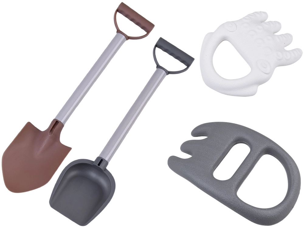 - Vozík, kyblík, 2 velké lopaty (rýč a saperka), 2 lopatky–šufánky, hrábě, klešťové hrábě, síto, konevka, váleček s mořským vzorem, formičky (hvězdice, velryba, chobotnice, mořský koník)