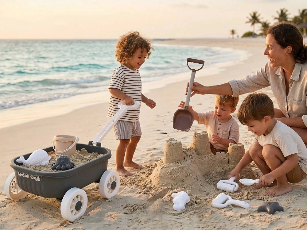 Hluboká vana, odnímatelné táhlo a stabilní široká kola zajistí snadné převážení písku, hraček i nástrojů po různých površích – od zahrady po pláž.