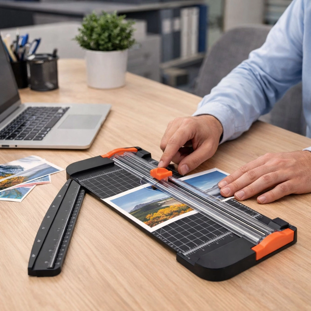 Tato lehká a stabilní řezačka papíru je navržena pro pohodlné a přesné řezání až do formátu A3. Průhledná vodicí lišta se zabudovaným posuvným nožem z oceli SK5 chrání prsty a zajišťuje čistý tah. Měřicí síť s pravítky v cm i palcích a úhloměr 45–90° usnadňují zarovnání a šikmé řezy.
