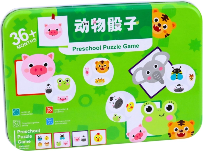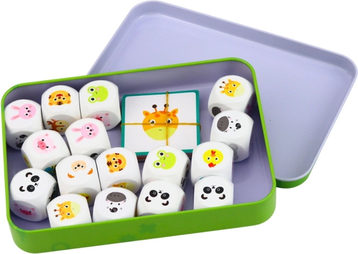 Chytrá hra pro děti, která rozvíjí logické myšlení, poznávací schopnosti a koordinační dovednosti. Úkolem je pomocí dřevěných kostek poskládat obrázek zvířátka podle karty se vzorem – skvělá zábava doma, v mateřské škole i na cestách díky praktické kovové krabičce.
