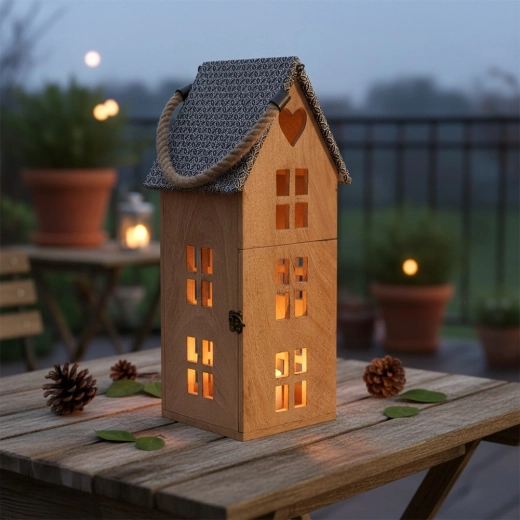 Objevte kouzlo teplého světla s dřevěným lampionem ve tvaru domečku. Ručně vyrobený z mangového dřeva s přirozenou kresbou, doplněný kovovou střechou a silným lanovým uchem pro snadné přenášení či zavěšení. Díky výřezům oken vytváří večer působivý světelný efekt, který promění každý prostor v útulné místo k odpočinku.