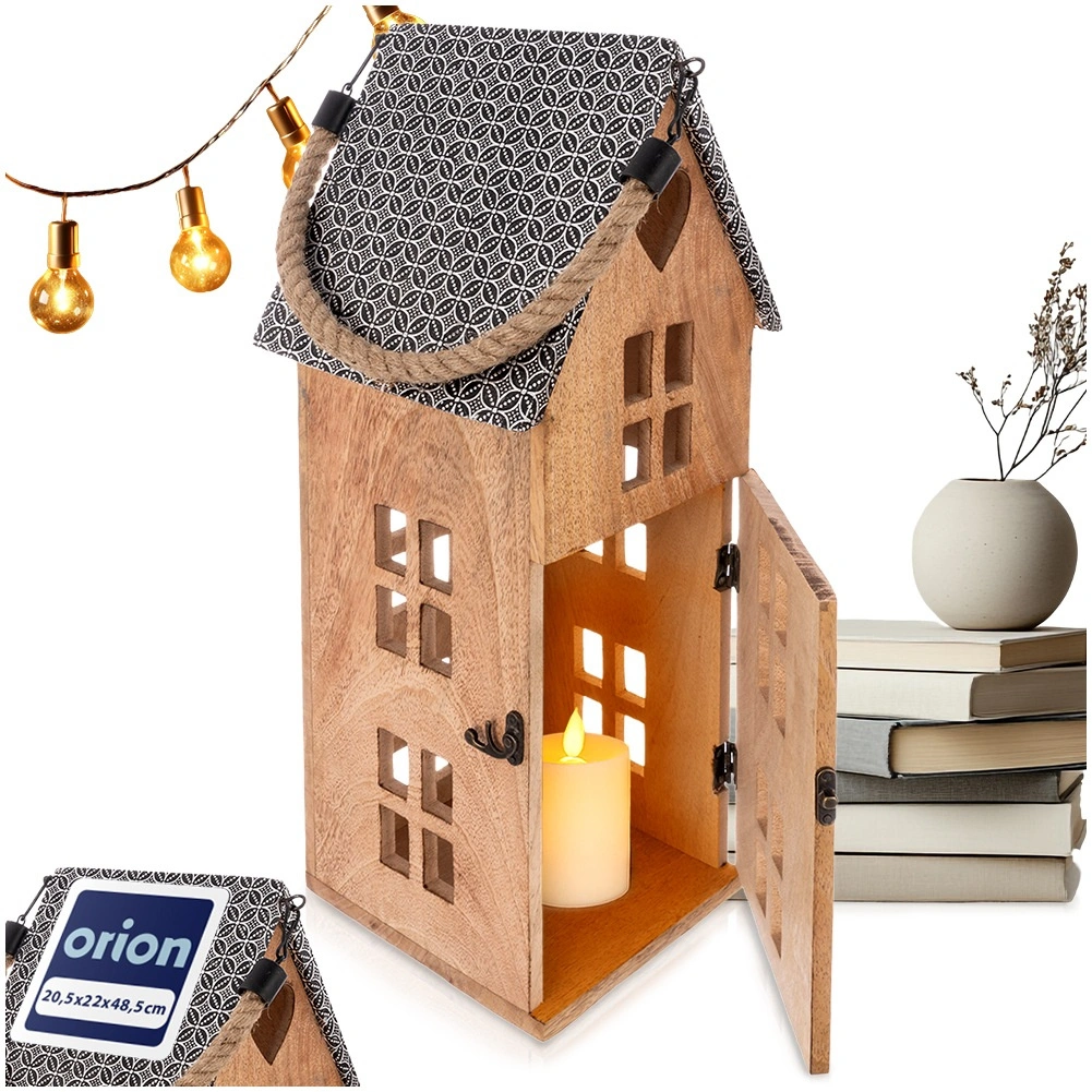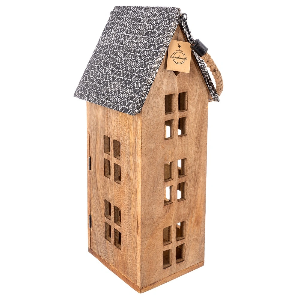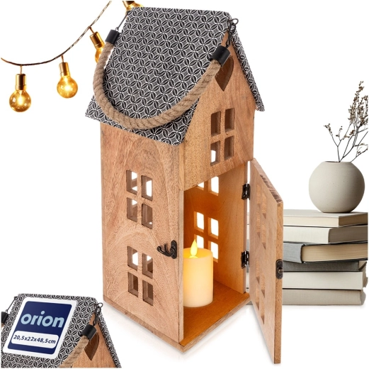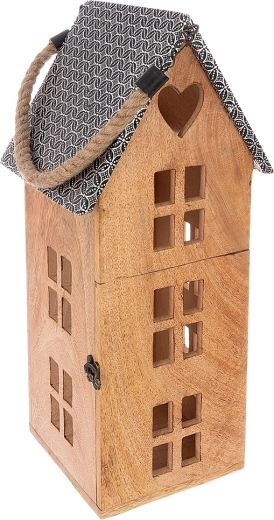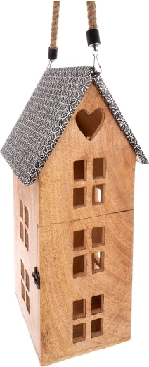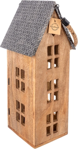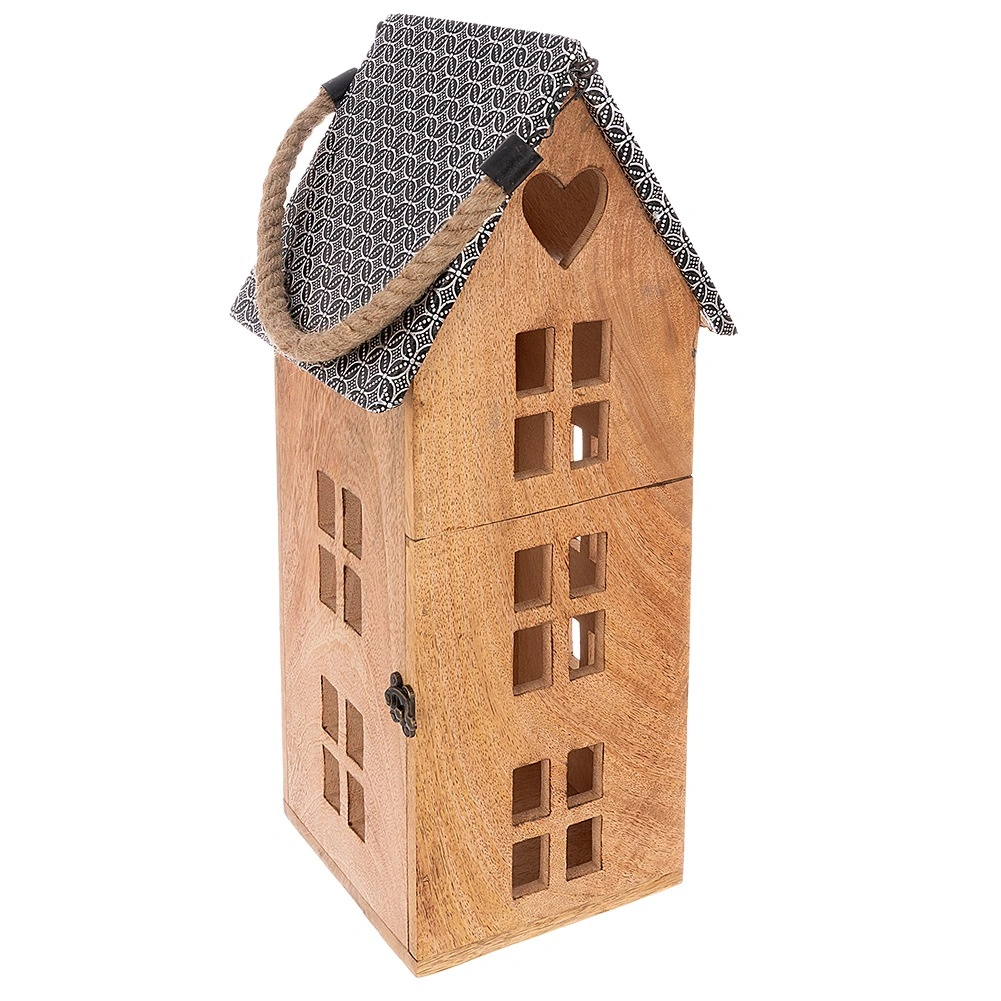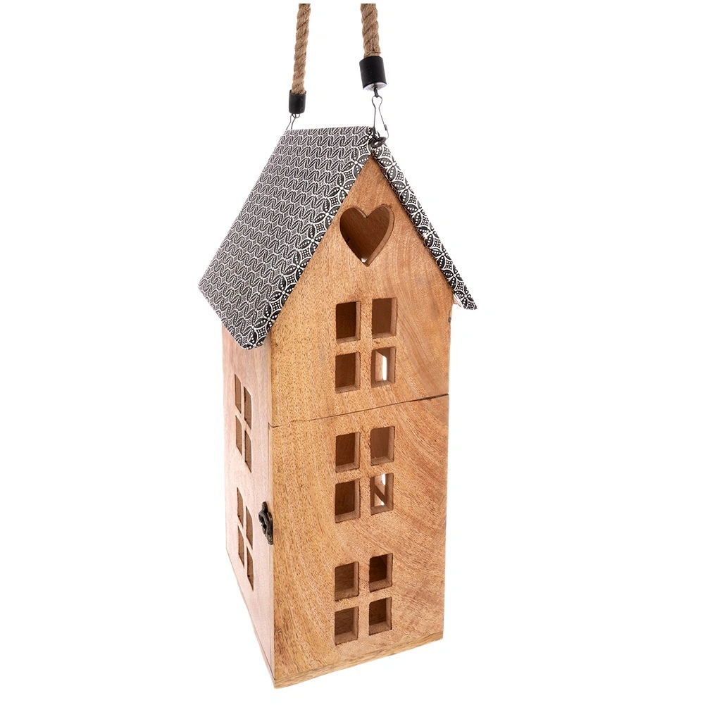 Stylový lampion ve tvaru domečku z mangového dřeva s kovovou střechou a robustním lanovým uchem. Určen pro bezpečné použití se svíčkou LED, vhodný na zavěšení i postavení. Nabízí útulné ambientní světlo, přírodní vzhled a odolnost vůči vlhkosti. Ideální do obýváku, ložnice, na terasu či balkon.