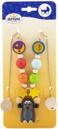 Závěs na kočárek Krtek je ideální pomůckou pro rodiče, kteří chtějí své děti zabavit při procházkách a zároveň je uvést do světa pohádkového hrdiny Krtečka. Dřevěné dílky a textilní prvky poskytují stimulaci zraku i hmatu vašeho dítěte.