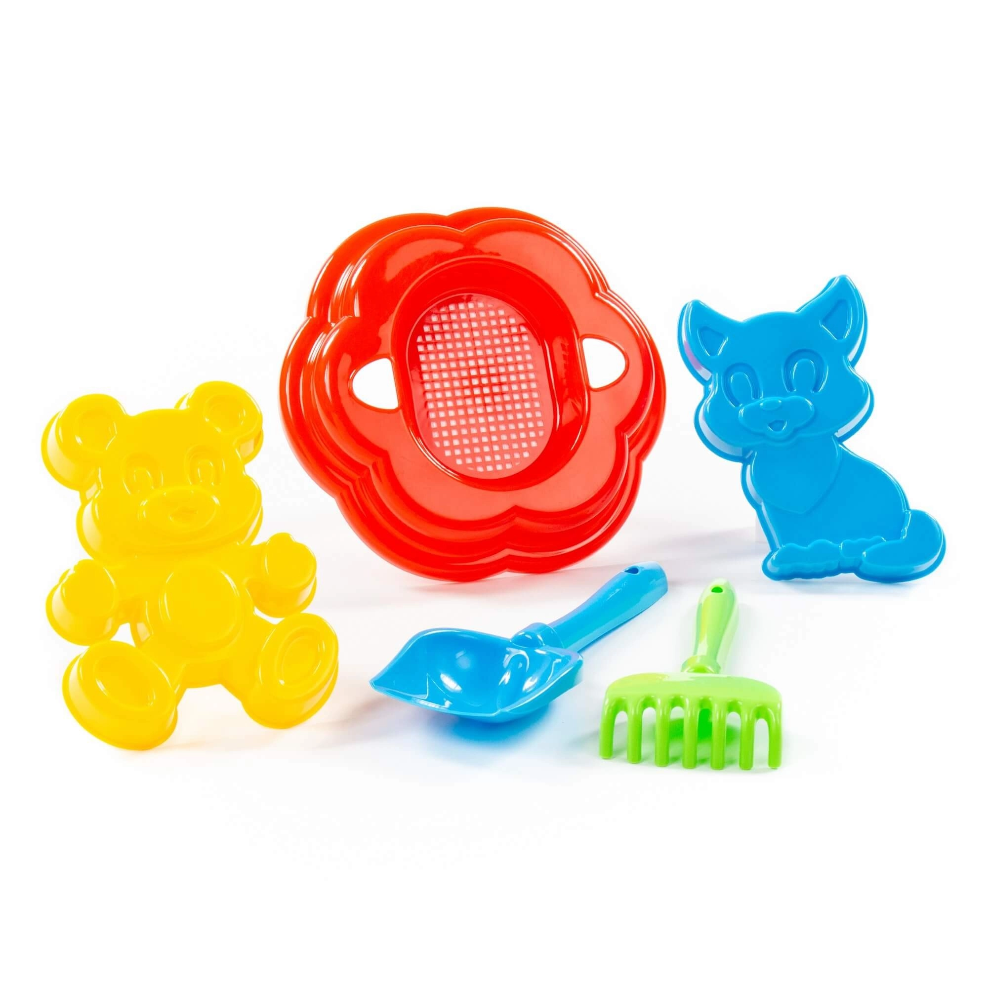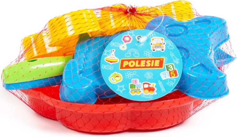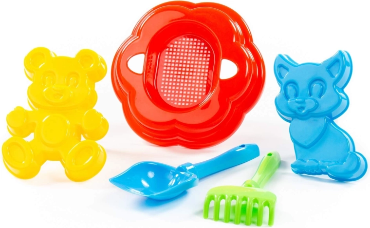 Obsah sady: velké síto ve tvaru květu s uchy, lopatka, hrábky a dvě formičky (koťátko a medvídek). Sada podporuje jemnou motoriku, kreativitu a hru na čerstvém vzduchu. Barevné varianty se liší, konkrétní barvu není možné zvolit – je zasílána náhodně podle dostupnosti.