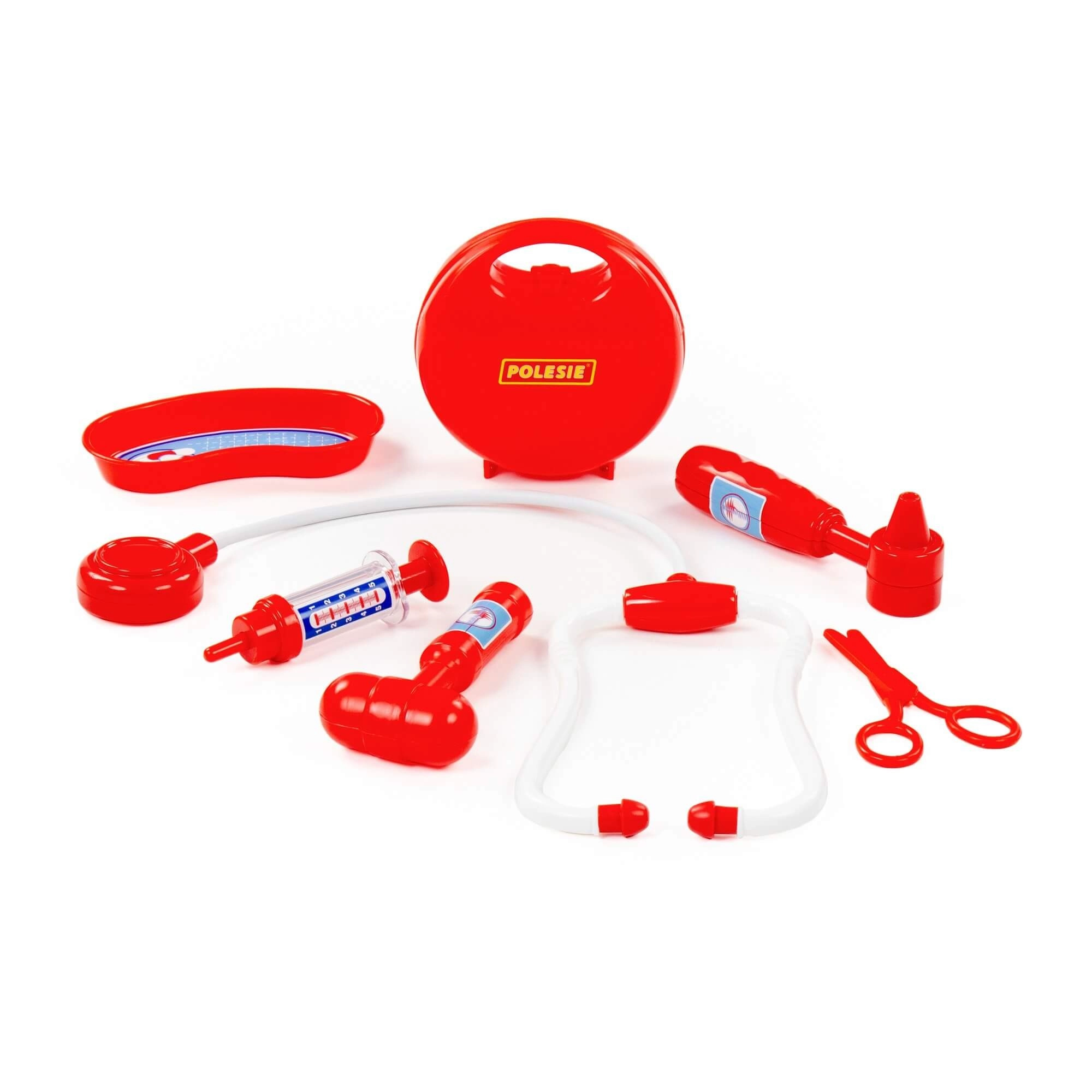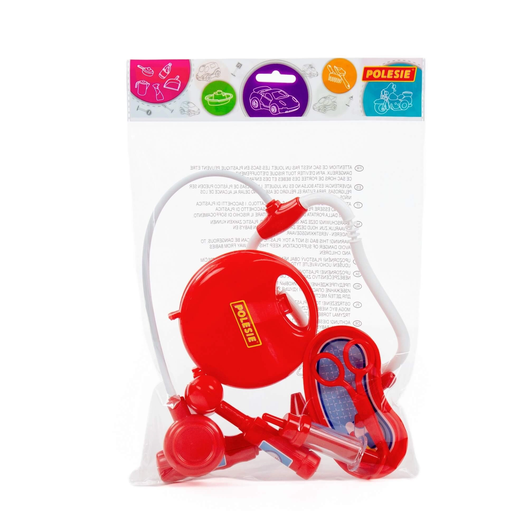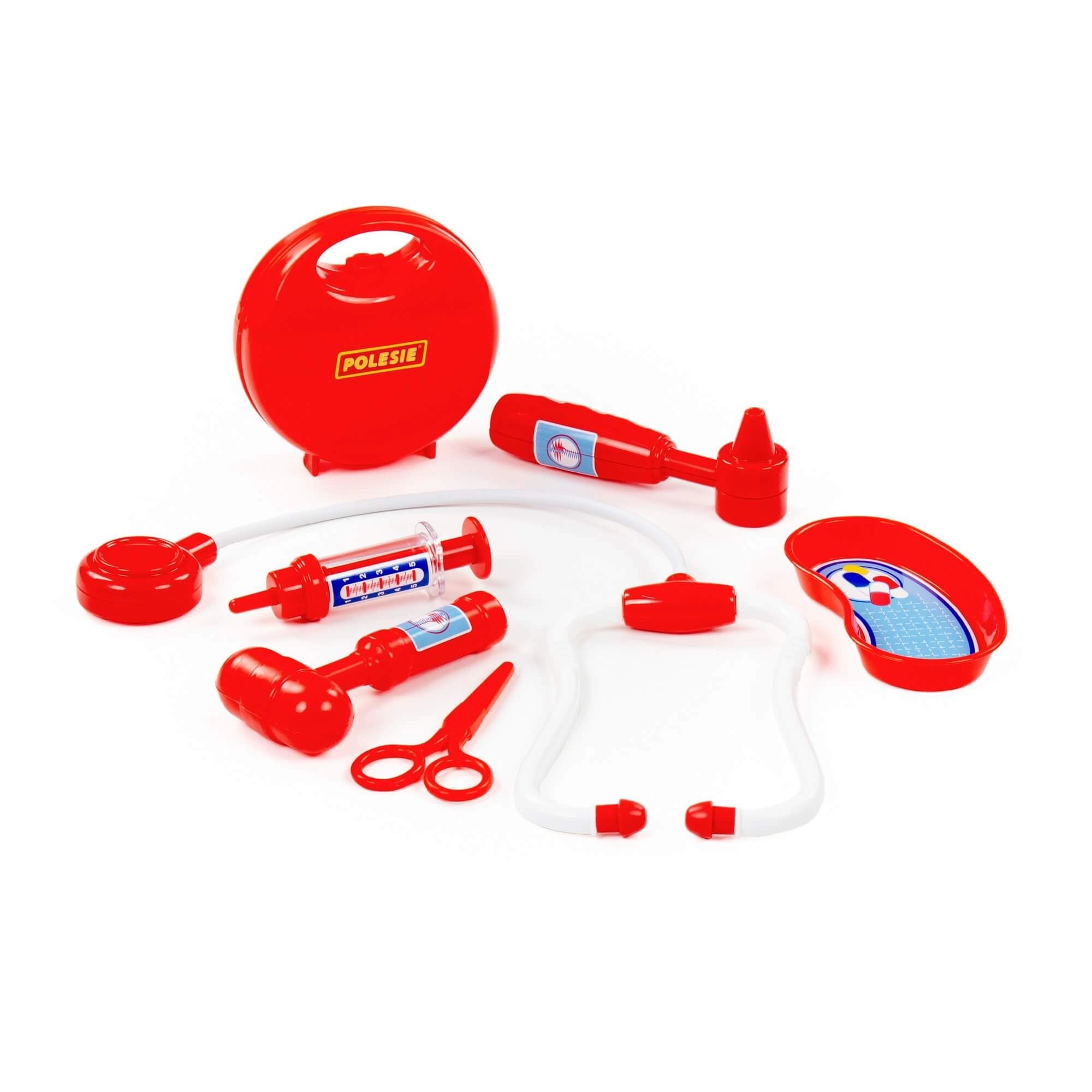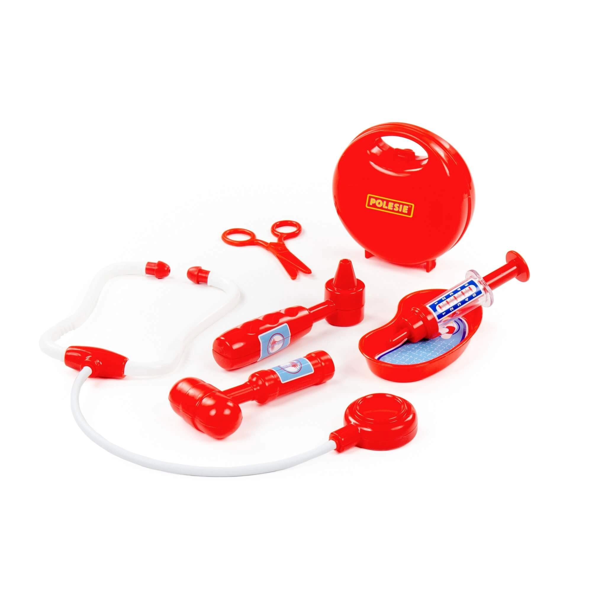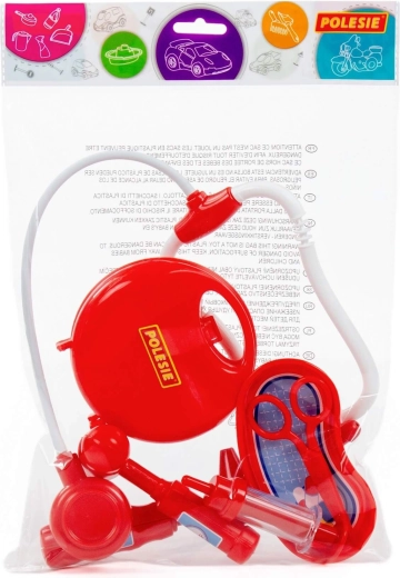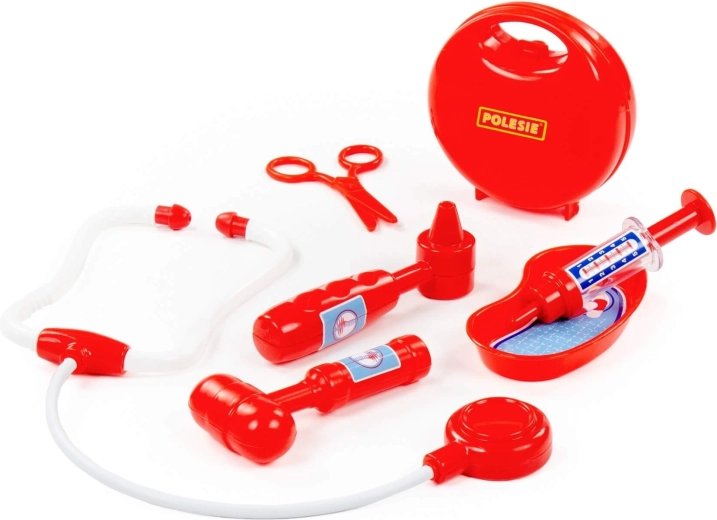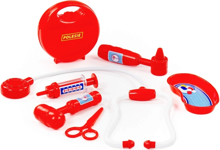 Součástí je stetoskop, injekční stříkačka, otoskop, reflexní kladívko, nůžky a miska – ledvina pro autentickou hru na lékaře.