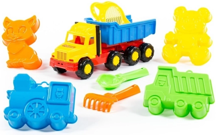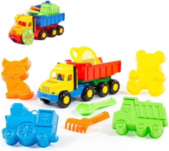 - Kompletní výbava: autíčko – sklápěč, sítko–květ, lopatka, hrábky a 4 formičky.
