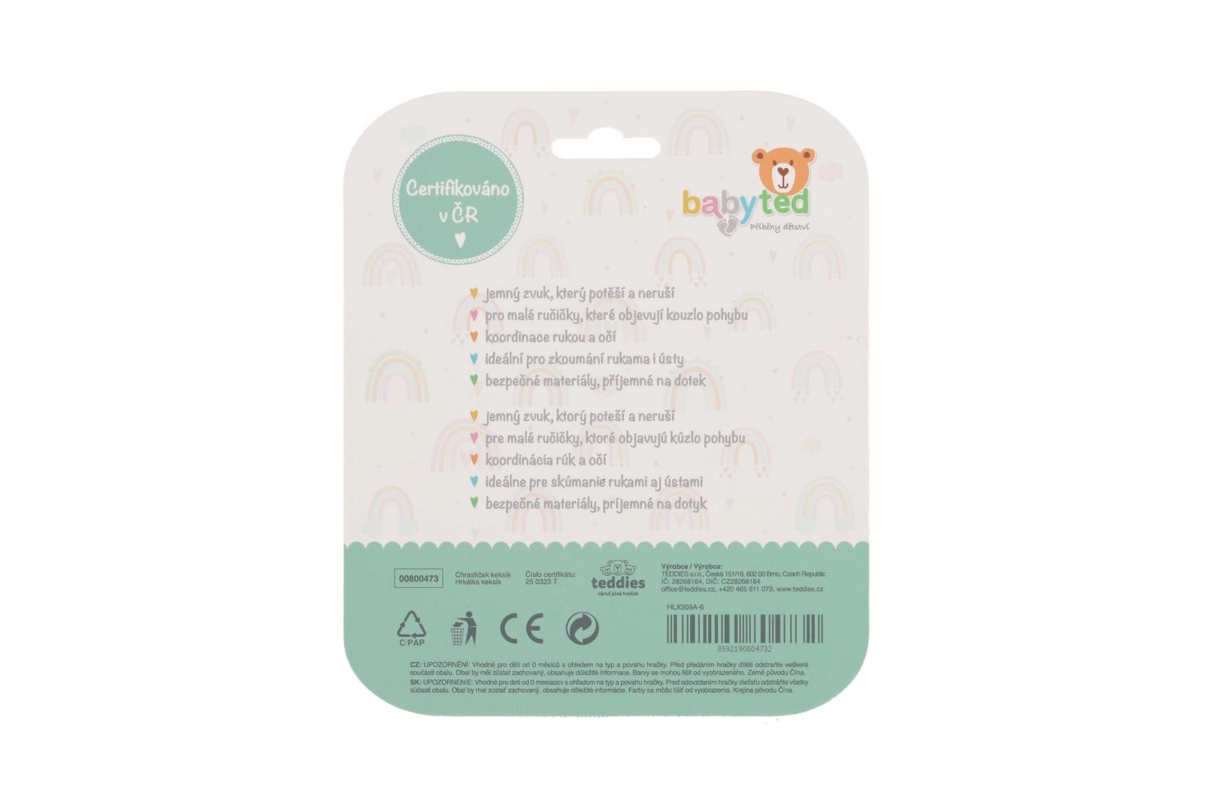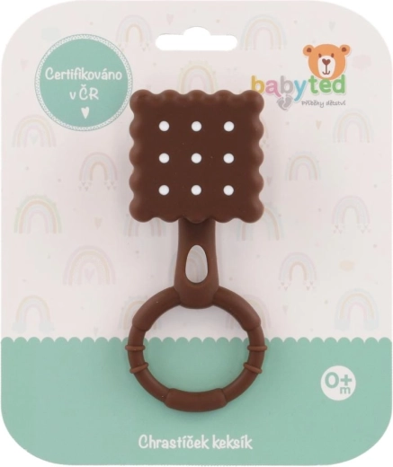 Roztomilé kousátko a chrastítko ve tvaru sušenky od značky BabyTed je ideální první hračka pro miminka již od narození. Měkký silikon šetrně masíruje dásně při růstu prvních zoubků, zatímco praktický kroužek usnadňuje úchop malými ručičkami. Lehká konstrukce podporuje jemnou motoriku a jemné chrastění rozvíjí sluchové vnímání. Bezpečné provedení a kvalitní zpracování, certifikováno v ČR.