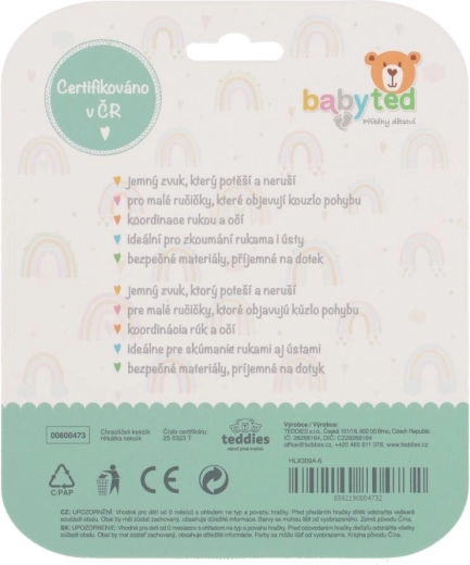 Tichý chrastivý zvuk rozvíjí sluchové vnímání dítěte bez nadměrného hluku, ideální pro klidné hraní.