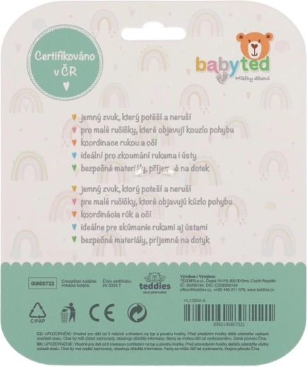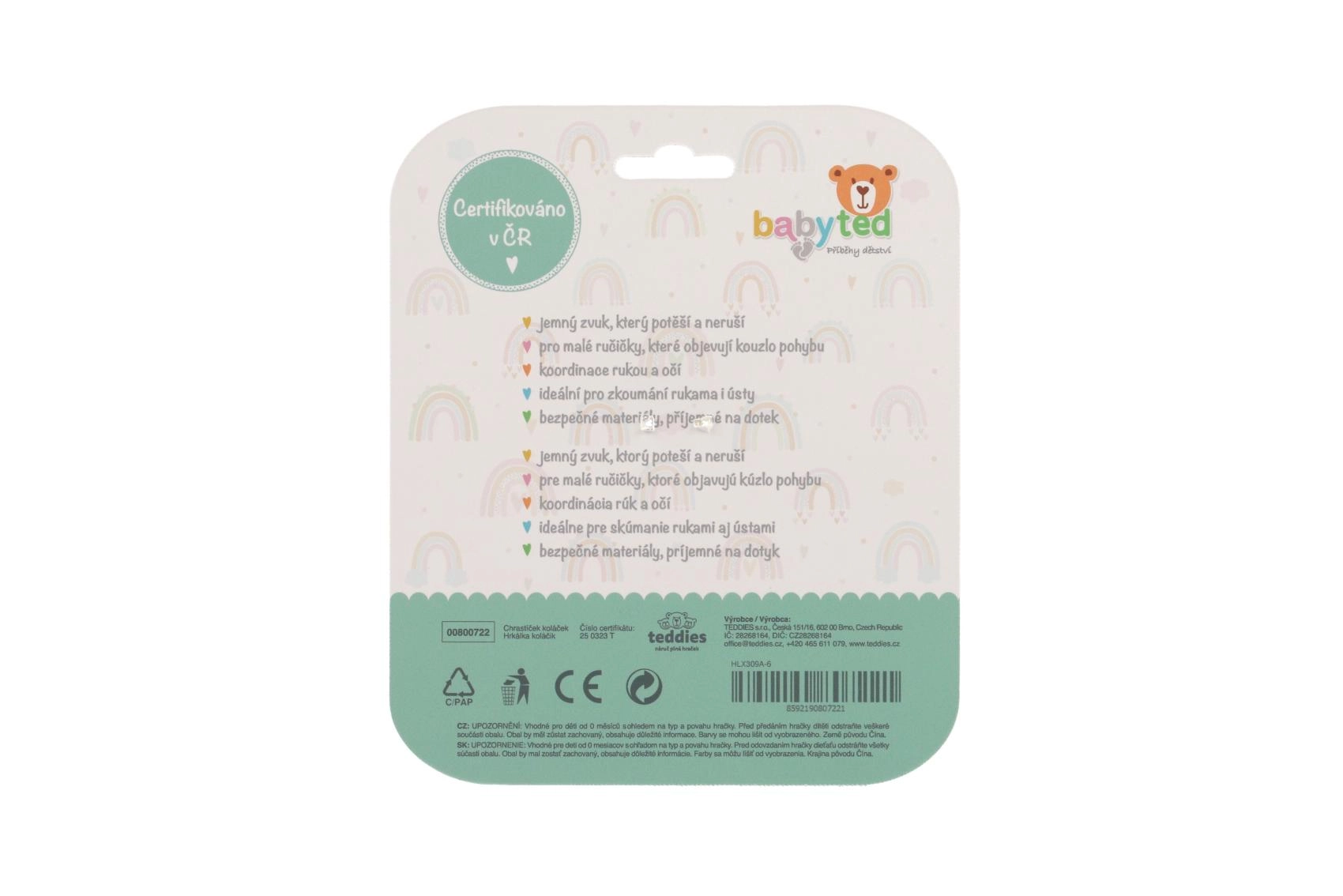 Roztomilé chrastítko a kousátko BABYTED je ideální první hračka pro miminka již od narození. Díky praktickému kroužku se snadno drží i v malých ručičkách, měkký silikon šetrně masíruje dásně při prořezávání prvních zoubků a jemné chrastění podporuje sluchové vnímání. Lehká konstrukce napomáhá rozvoji jemné motoriky a bezpečné, snadno omyvatelné provedení usnadňuje každodenní použití.