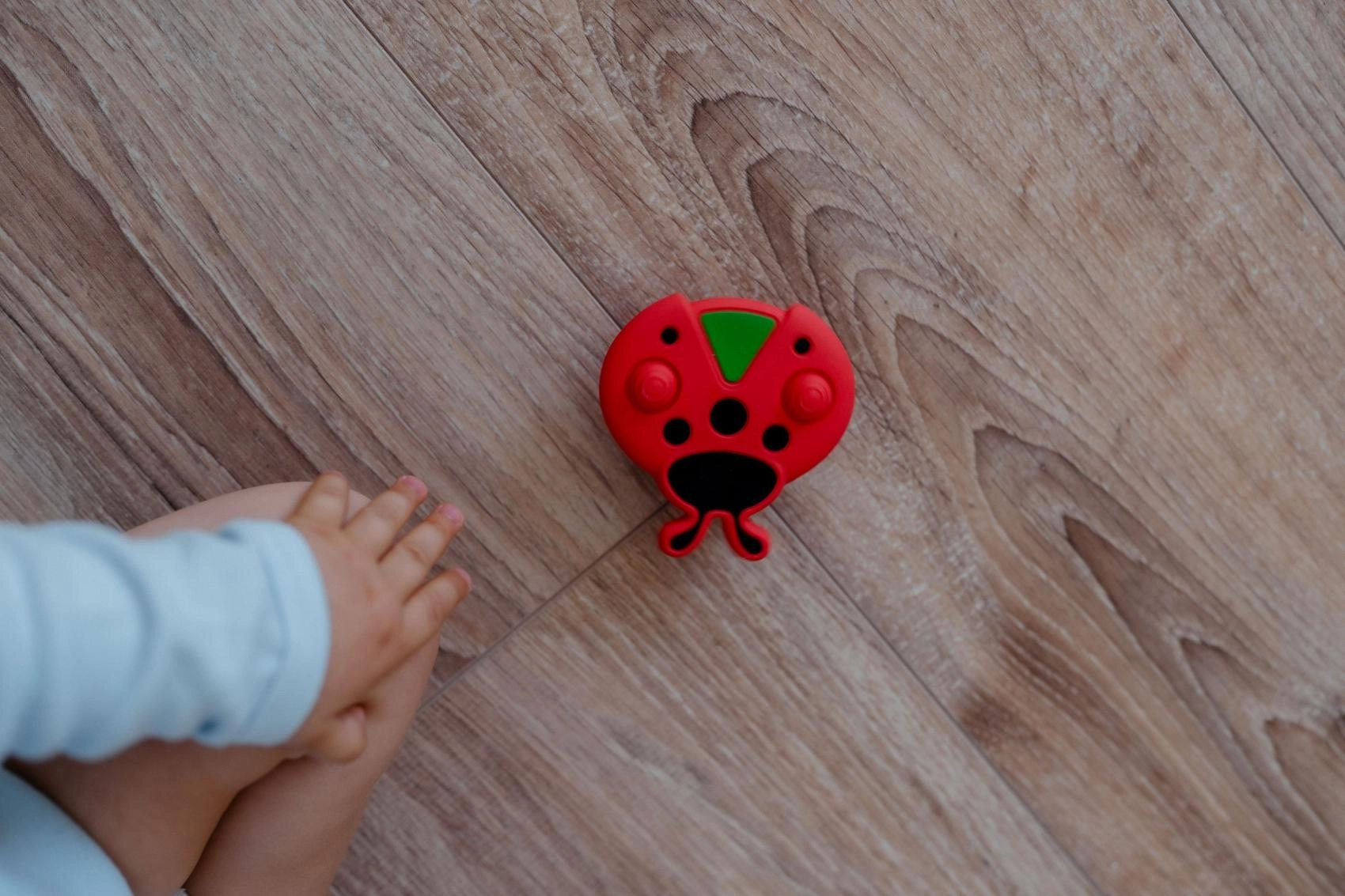 Otočný střed a hmatové prvky (bublinky, výstupky) vybízejí ke stisknutí, otáčení a zkoumání, čímž přirozeně rozvíjejí koordinační dovednosti, úchop a jemnou motoriku. Kontrastní červená s černými puntíky a zeleným detailem podporují zrakové vnímání a udržují dětskou pozornost.