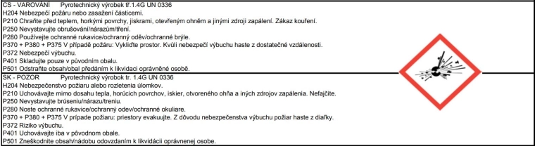 Bezpečnostní pokyny: Používejte výhradně ve venkovních prostorech. Chraňte před teplem, horkými povrchy, jiskrami a otevřeným ohněm; zákaz kouření. Nevystavujte obrušování, nárazům ani tření. Používejte ochranné rukavice, oděv a brýle. V případě požáru vyklidte prostor a haste z dostatečné vzdálenosti – hrozí nebezpečí výbuchu. Odpad odevzdejte k likvidaci oprávněné osobě.