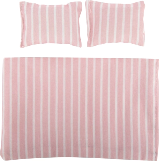 Manželská postel s jednotnou přikrývkou, polštáři a dvojicí koberečků vytváří pohodlné místo pro odpočinek panenek a dodává domečku autentickou atmosféru.