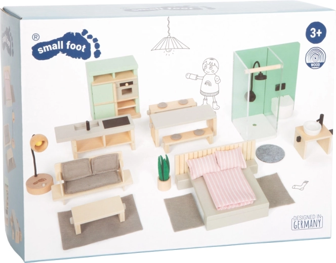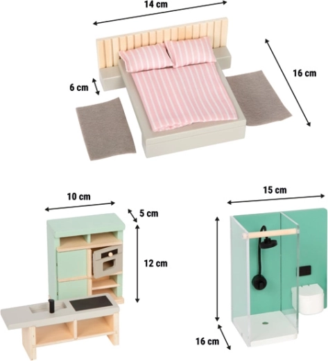 Proměňte domeček pro panenky v moderní a útulný domov s touto kompletní sadou od Small Foot. Set zahrnuje vybavení do ložnice, koupelny, kuchyně, jídelny i obýváku ve skandinávském stylu. Děti si zamilují přírodní dřevo, jemné pastelové barvy, moderní detaily a možnost hraní rolí s panenkami do 12 cm.