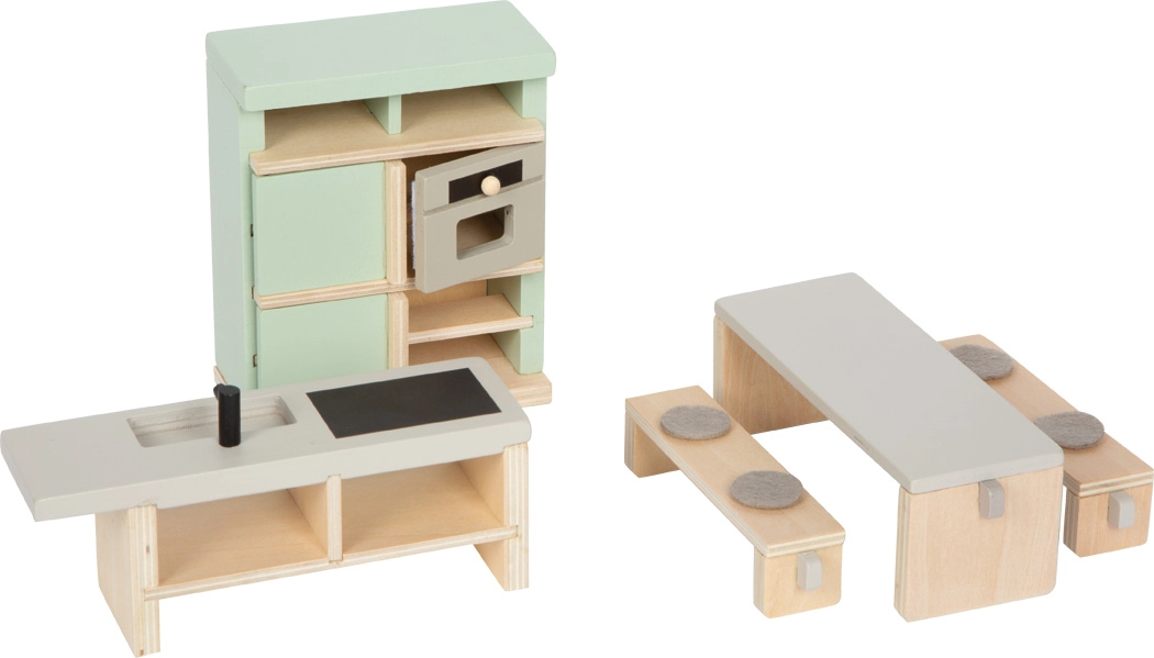 Skandinávský design s vysokým podílem přírodního dřeva a jemnými barvami podporuje harmonický vzhled každého domečku. Díky robustním materiálům (dřevo, kov, látka, plsť) je sada vhodná pro každodenní hraní a rozvoj představivosti, jemné motoriky i sociálních dovedností.