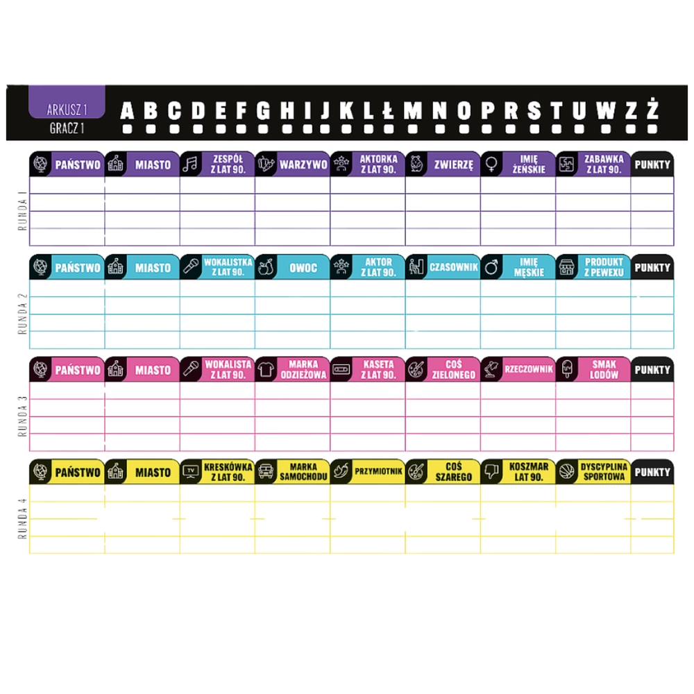 V této oblíbené společenské hře hráči losují písmeno a v časovém limitu zapisují slova do kategorií jako stát, město, zvíře, předmět nebo jméno. Body získáte za správné a jedinečné odpovědi – kdo jich má nejvíc, vyhrává. Hra je rychlá, chytlavá a přináší spoustu smíchu i nostalgie.