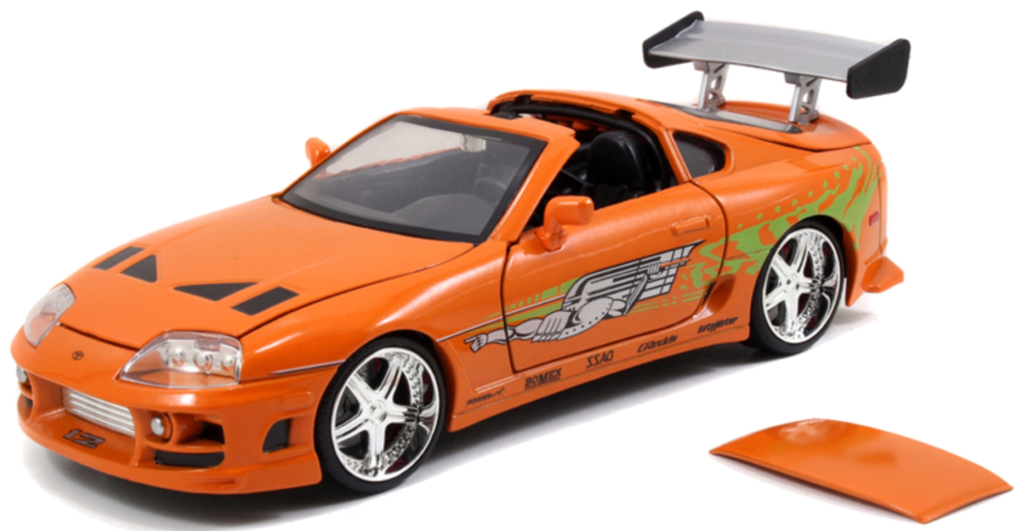 Užijte si adrenalin série Fast & Furious s precizní replikou Toyota Supra od značky Jada Toys. Model v měřítku cca 19 cm nabízí kovovou karoserii, otevírací dveře a víko kufru a detailní zpracování v ikonické oranžové barvě – perfektní pro sběratele i fanoušky rychlých aut.