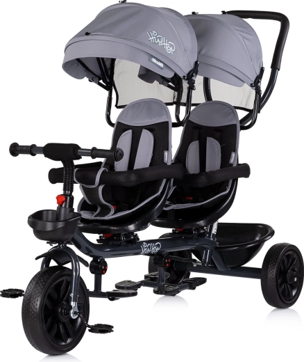 Tato robustní tříkolka pro dvojčata je navržena pro pohodlné a bezpečné cestování dvou dětí (každé do 20 kg). Sedadla lze nastavit po směru jízdy nebo proti sobě, a obě se otáčí o 360°, takže snadno přizpůsobíte uspořádání aktuálním potřebám. Rodičovská rukojeť zajišťuje přesné vedení a jisté ovládání v každém terénu.