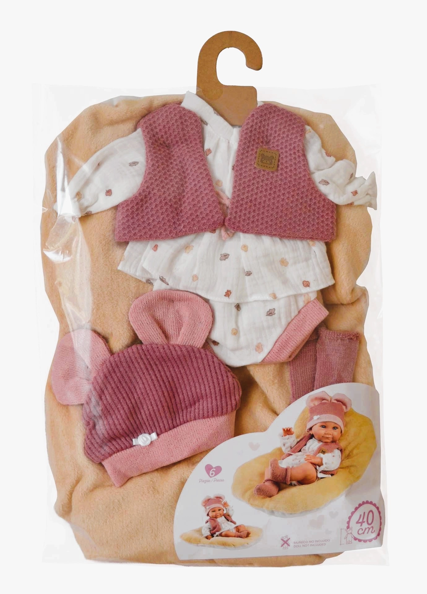 Součástí balení jsou 4 kusy oblečení a oboustranný polštář, který lze využít i jako měkkou podložku pro pohodlné odpočívání panenky. Vše je ručně vyrobené ve Španělsku a dodáváno v igelitovém obalu s ramínkem pro snadné uložení.