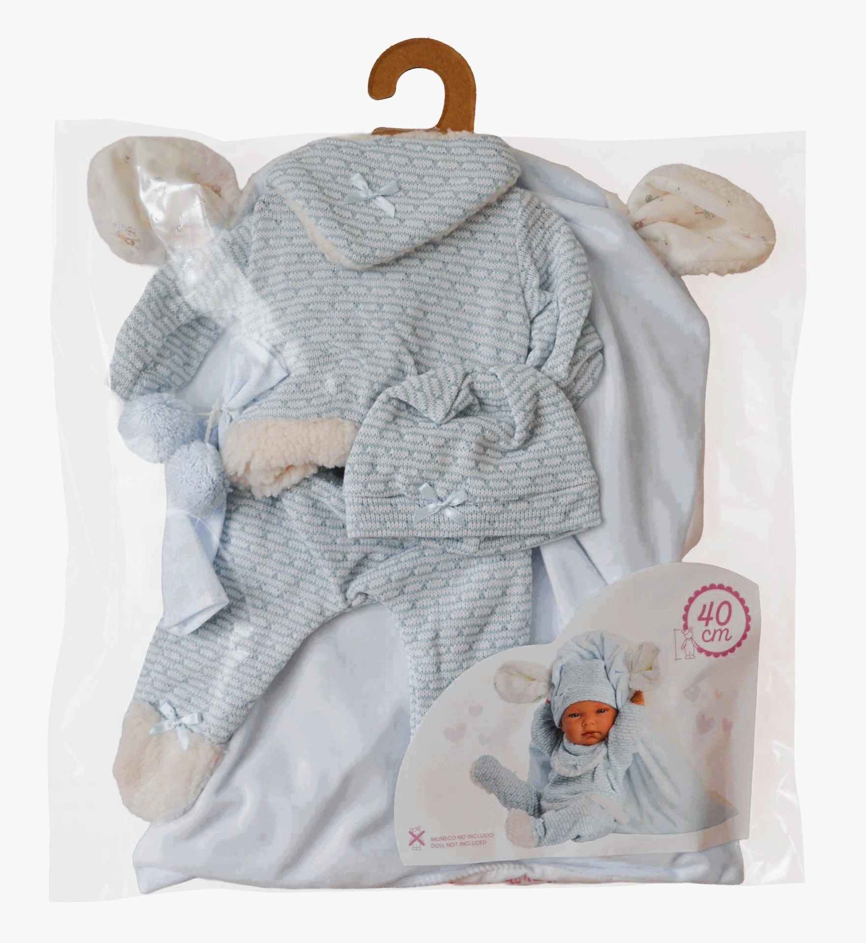 Praktický komplet zahrnuje i muchlíka s bambulkami a dekorativní polštářek, který lze použít jako podložku pro pohodlné ukládání panenky. Celý set je sladěn do jemných, dětsky přívětivých tónů a je zabalen v igelitovém obalu s ramínkem pro snadné ukládání.