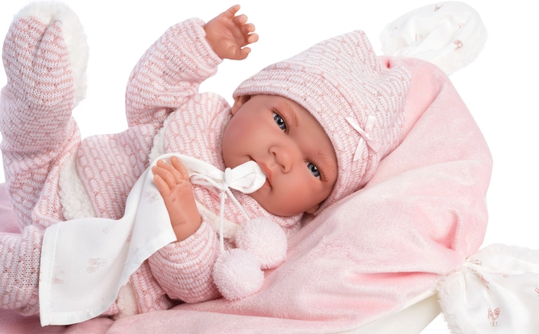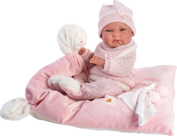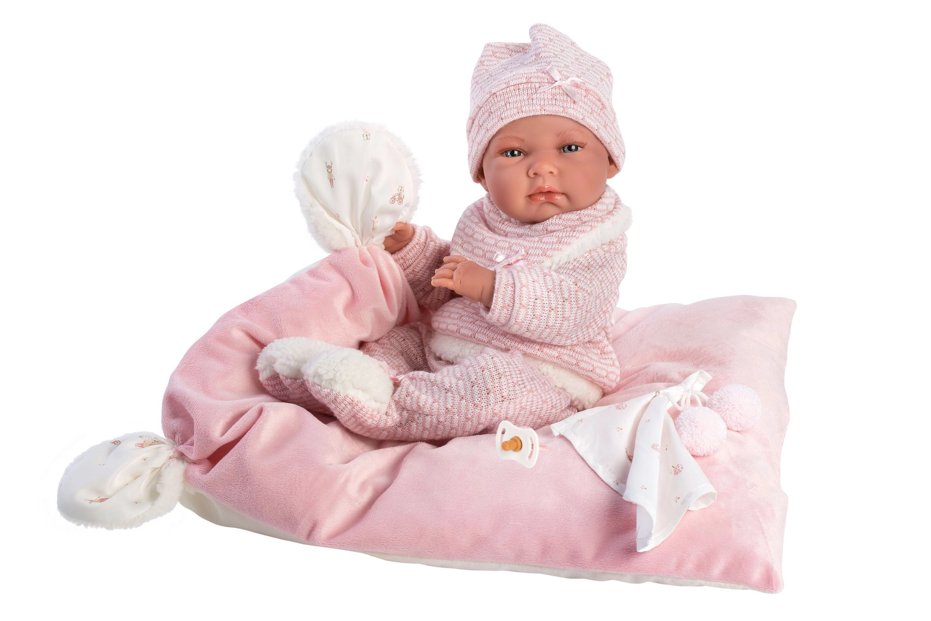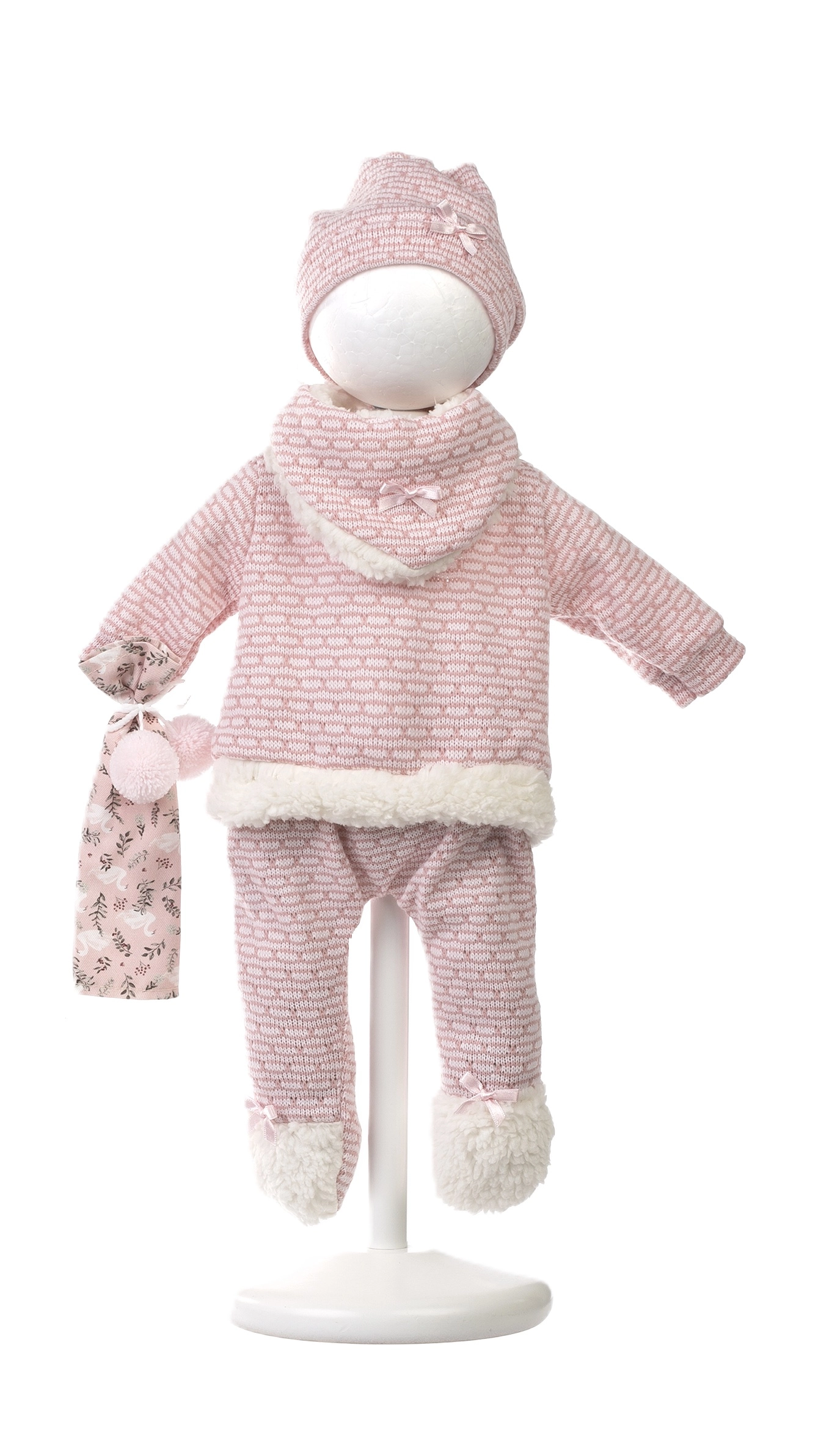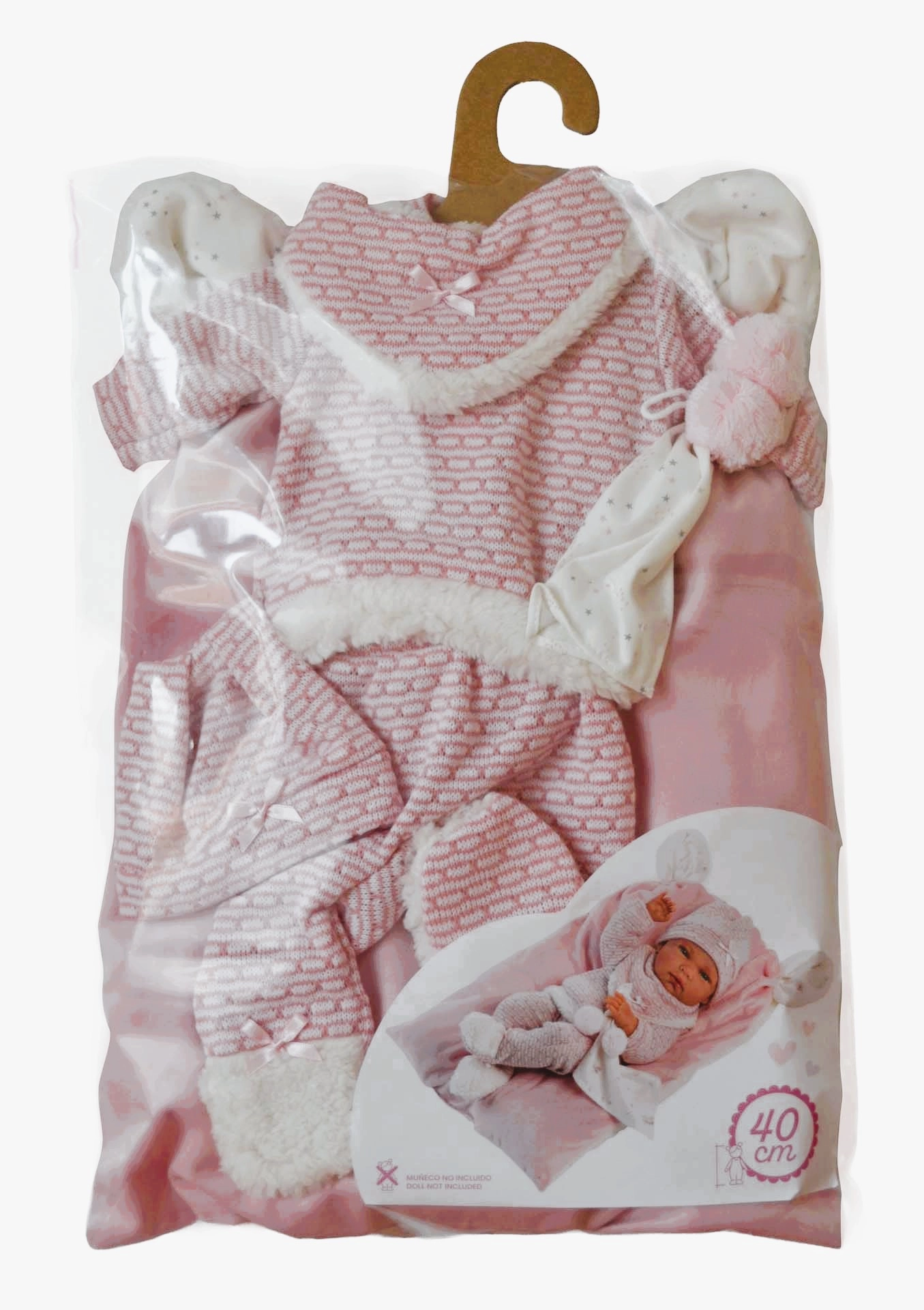 Stylový a hřejivý set oblečení pro panenku přináší vše, co malí pečovatelé potřebují: měkké pletené kousky s jemným kožíškem, roztomilého muchlíka s bambulkami a dekorativní polštářek, který poslouží i jako pohodlná podložka. Vše je navrženo pro panenky Llorens NEW BORN o velikosti 40–42 cm.