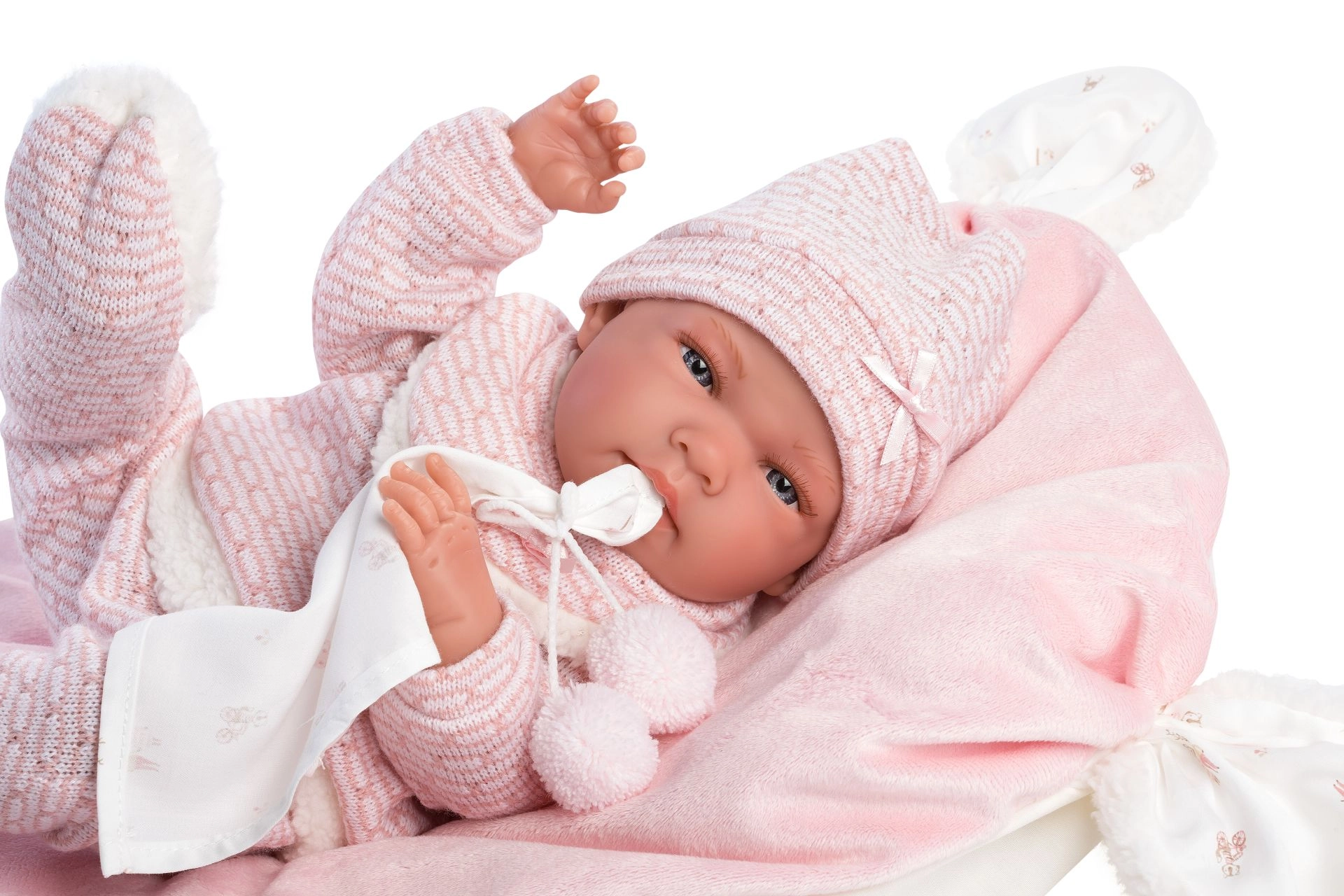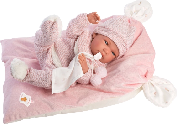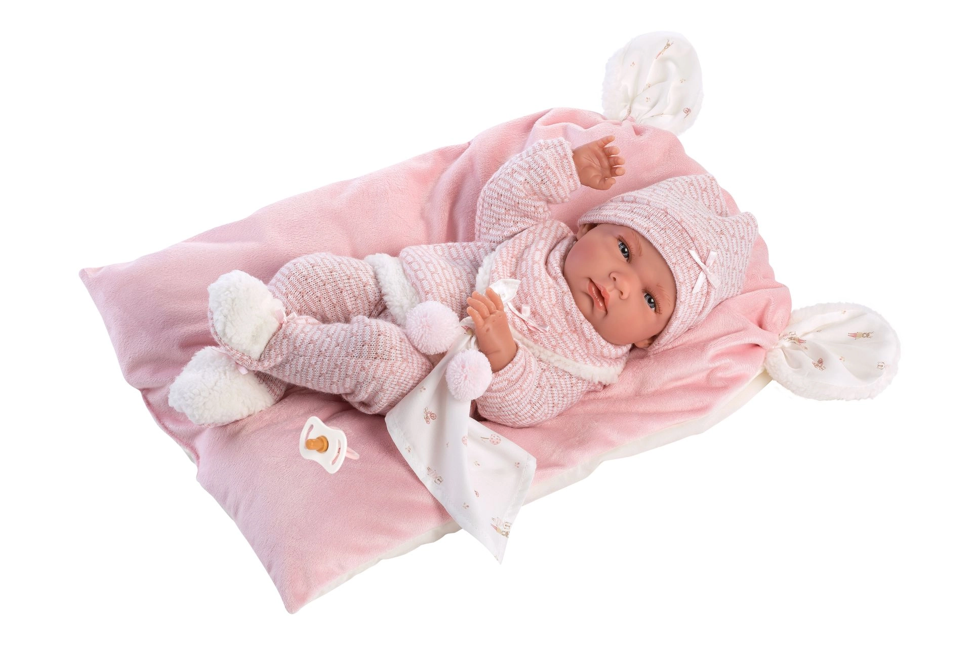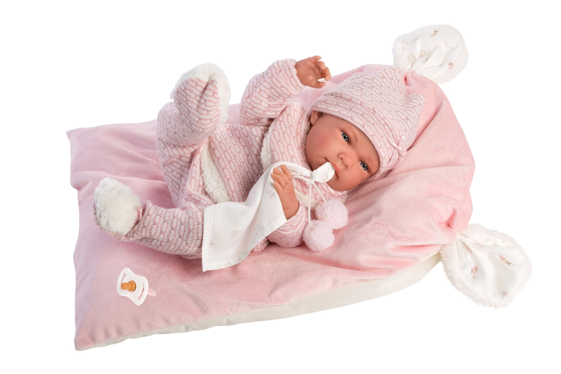 Stylový a hřejivý set oblečení pro panenku přináší vše, co malí pečovatelé potřebují: měkké pletené kousky s jemným kožíškem, roztomilého muchlíka s bambulkami a dekorativní polštářek, který poslouží i jako pohodlná podložka. Vše je navrženo pro panenky Llorens NEW BORN o velikosti 40–42 cm.