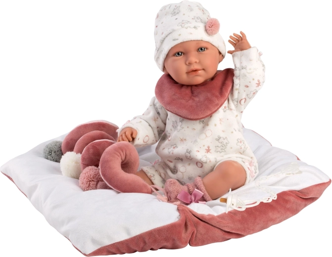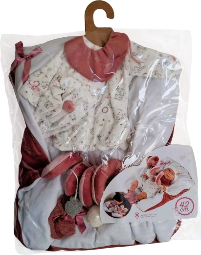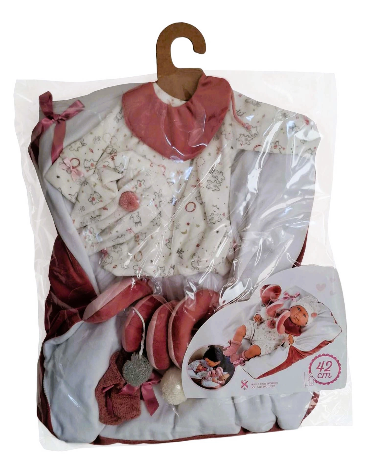 Sada zahrnuje sladěný obleček, sametový bryndák a měkoučkou podložku, takže vaše panenka má vše pro každodenní péči i pohodlné uložení.
