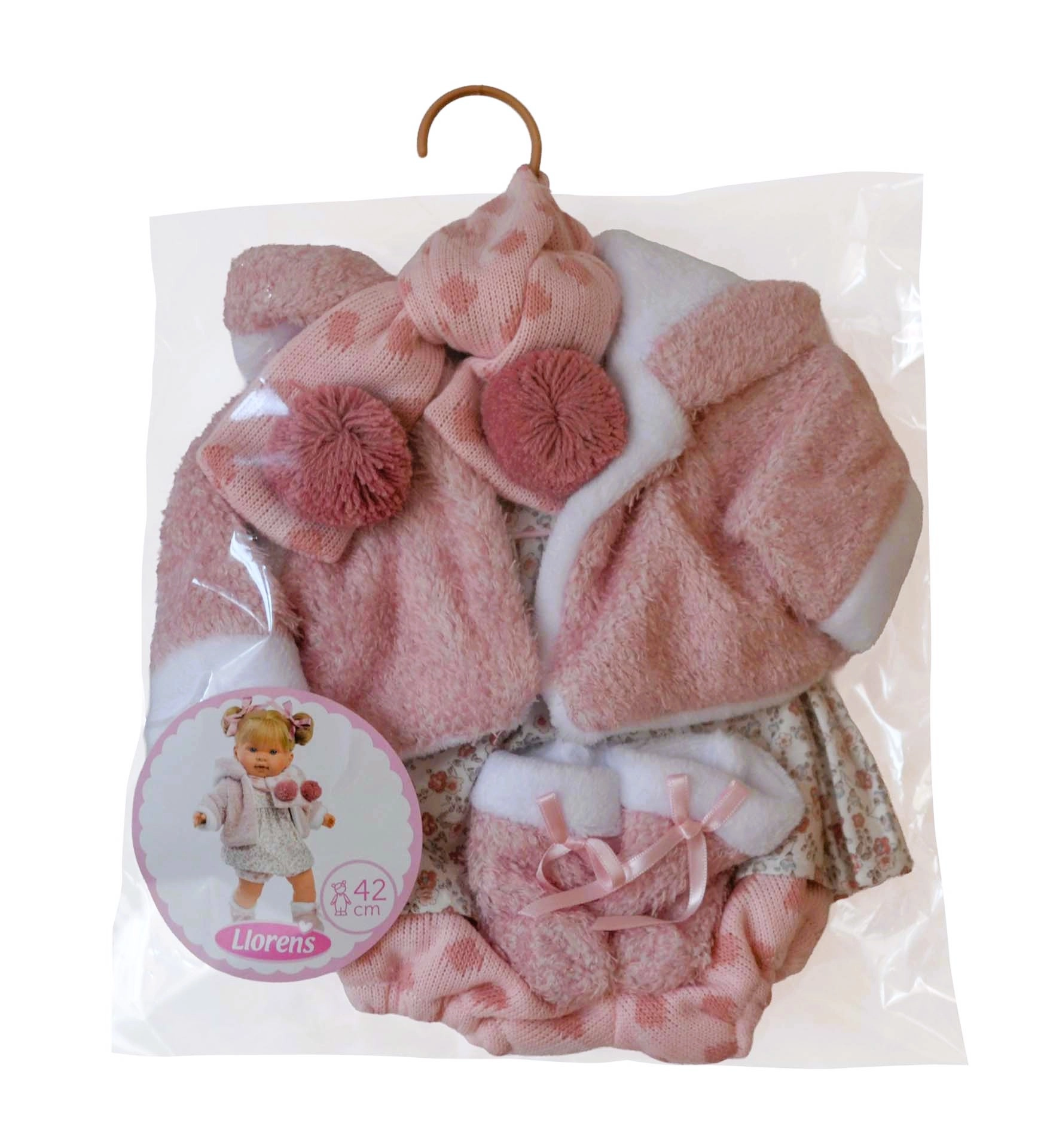 Stylový set pro panenky LLORENS ve velikosti 42 cm potěší každou malou parádnici. Obsahuje 5 pečlivě sladěných kousků z měkkých textilií – růžový huňatý kabátek s bílým lemem, čepici/šálu s bambulkami, palčáky a květinové šatičky s kalhotkami. Oblečky jsou ručně vyrobené ve Španělsku a dodávají se v praktickém obalu s ramínkem. Ideální pro předstíranou hru a rozvoj jemné motoriky. Vhodné od 3 let.