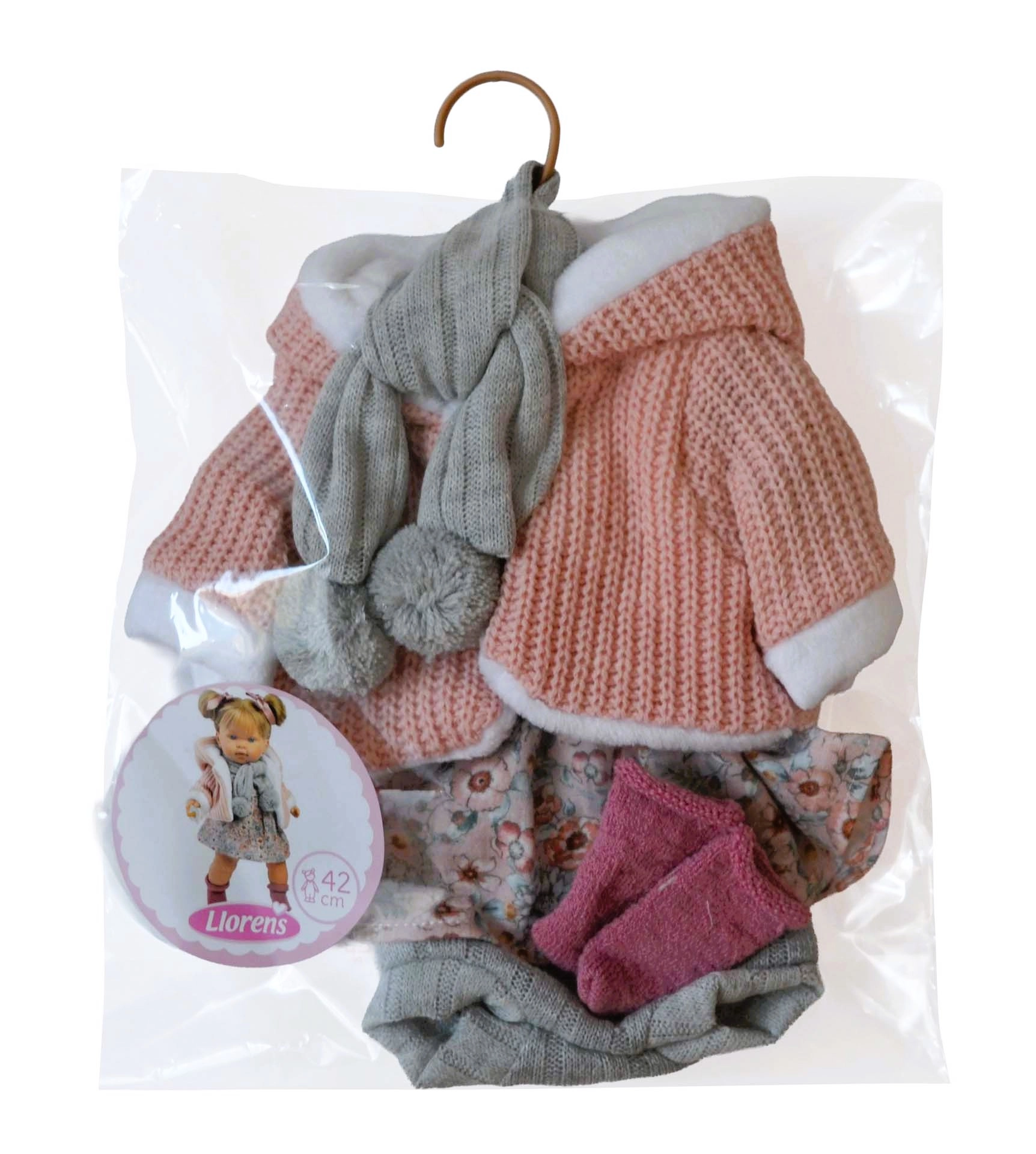 Stylový 5dílný set oblečení pro panenky velikosti 42 cm přináší dokonalou kombinaci pohodlí a elegance. Najdete v něm růžovou pletenou mikinu s kapucí, šedou šálu s bambulkami, květovanou sukni, šedé kraťásky a růžové ponožky. Set je ručně vyroben ve Španělsku, pečlivě zpracovaný a ideální pro rozvoj fantazie a dovedností při převlékání panenek.